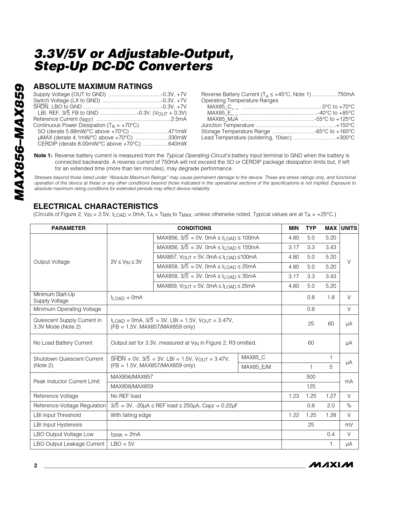 3.3V/5V or Adjustable-Output, Step-Up DC-DC Converters. ABSOLUTE MAXIMUM RATINGS. Note 1:. MAX856–MAX859
