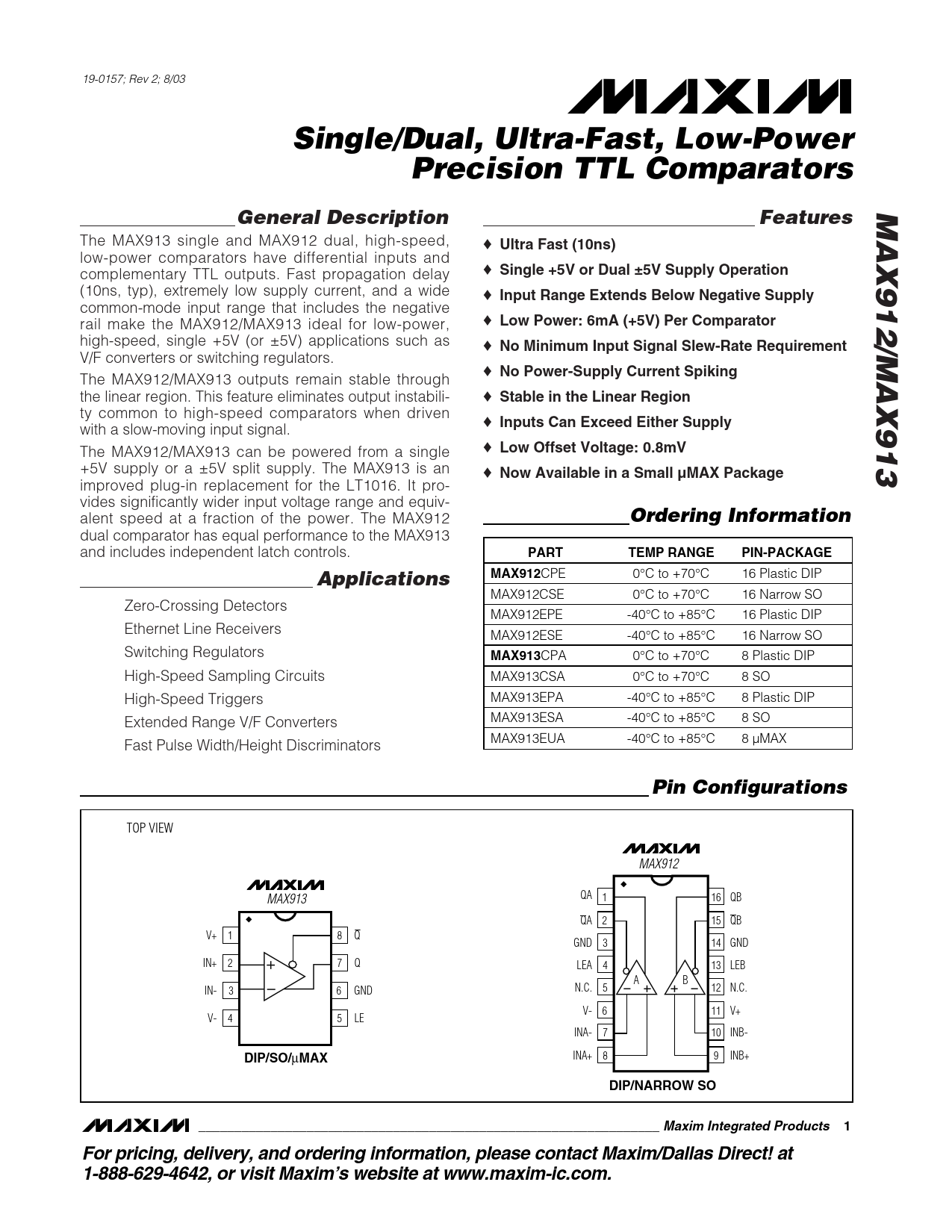 Single/Dual, Ultra-Fast, Low-Power Precision TTL Comparators MAX912/MAX913 General Description Features