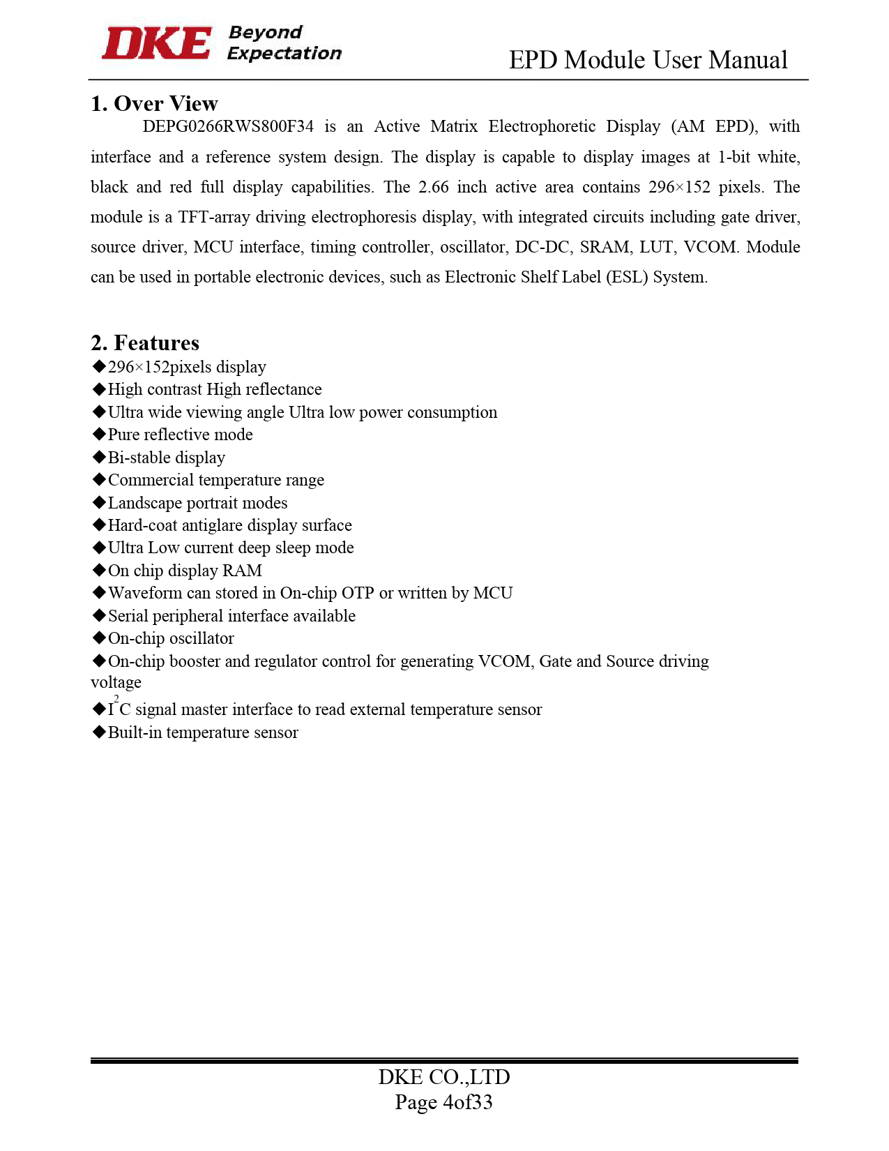 EPD Module User Manual 1. Over View DEPG0266RWS800F34 is an Active Matrix Electrophoretic Display (AM EPD), with interface and a reference system design. The display is capable to display images at 1-bit white, black and red full display capabilities. The 2.66 inch active area contains 296×152 pixels. The module is a TFT-array driving electrophoresis display, with integrated circuits including gate driver, source driver, MCU interface, timing controller, oscillator, DC-DC, SRAM, LUT, VCOM. Module can be used in portable electronic devices, such as Electronic Shelf Label (ESL) System. 2. Features ◆296×152pixels display ◆High contrast High reflectance ◆Ultra wide viewing angle Ultra low power consumption ◆Pure reflective mode ◆Bi-stable display ◆Commercial temperature range ◆Landscape portrait modes ◆Hard-coat antiglare display surface ◆Ultra Low current deep sleep mode ◆On chip display RAM ◆Waveform can stored in On-chip OTP or written by MCU ◆Serial peripheral interface available ◆On-chip oscillator ◆On-chip booster and regulator control for generating VCOM, Gate and Source driving voltage ◆I2C signal master interface to read external temperature sensor ◆Built-in temperature sensor DKE CO.,LTD Page 4of33 Document Outline Update: 13. Packaging 1. Over View 2. Features 3. Mechanical and Optical Specification . 4.Mechanical Drawing of EPD Module 5. Input/output Pin Assignment 6. Electrical Characteristics 6.1 Absolute Maximum Rating 6.2 Panel DC Characteristics 6.3 Panel DC Characteristics(Driver IC Internal Re Notes:VGH,VGL,VSH,VSL drop voltage<2V. 6.4 Panel AC Characteristics 6.4.1 MCU Interface Selection 6.4.2 MCU Serial Interface (4-wire SPI) 6.4.3 MCU Serial Interface (3-wire SPI) 6.4.4 Interface Timing 7.Command Table 9. Typical Application Circuit with SPI Interface 10.Typical Operating Sequence 10.1 LUT from OTP Operation Flow 10.2 LUT from OTP Operation Reference Program Code ACTION VALUE/DATA COMMENT POWER ON 3v delay 10ms PIN CONFIG RESE# low Hardware reset delay 200us RESE# high delay 200us Read busy pin Wait for busy low Command 0x12 Software reset Read busy pin Wait for busy low SET VOLTAGE AND LOAD LUT LOAD IMAGE AND UPDATE Command 0x24 5624bytes Load BW image (152/8*296)(BW) Command 0x26 5624bytes Load image (152/8*296) (RED) Command 0x20 Read busy pin Wait for busy low Command 0x10 Data 0X01 Enter deep sleep mode POWER OFF 11. Reliability Test 12. Quality Assurance 12.1 Environment 12.2 Illuminance 12.3 Inspect method 12.4 Display area 12.5 Ghosting test method 12.6 Inspection items and acceptance criteria 12.6.1Electric defect 12.6.2 Visual defect 13.Packaging 14. Handling, Safety, and Environment Requirement