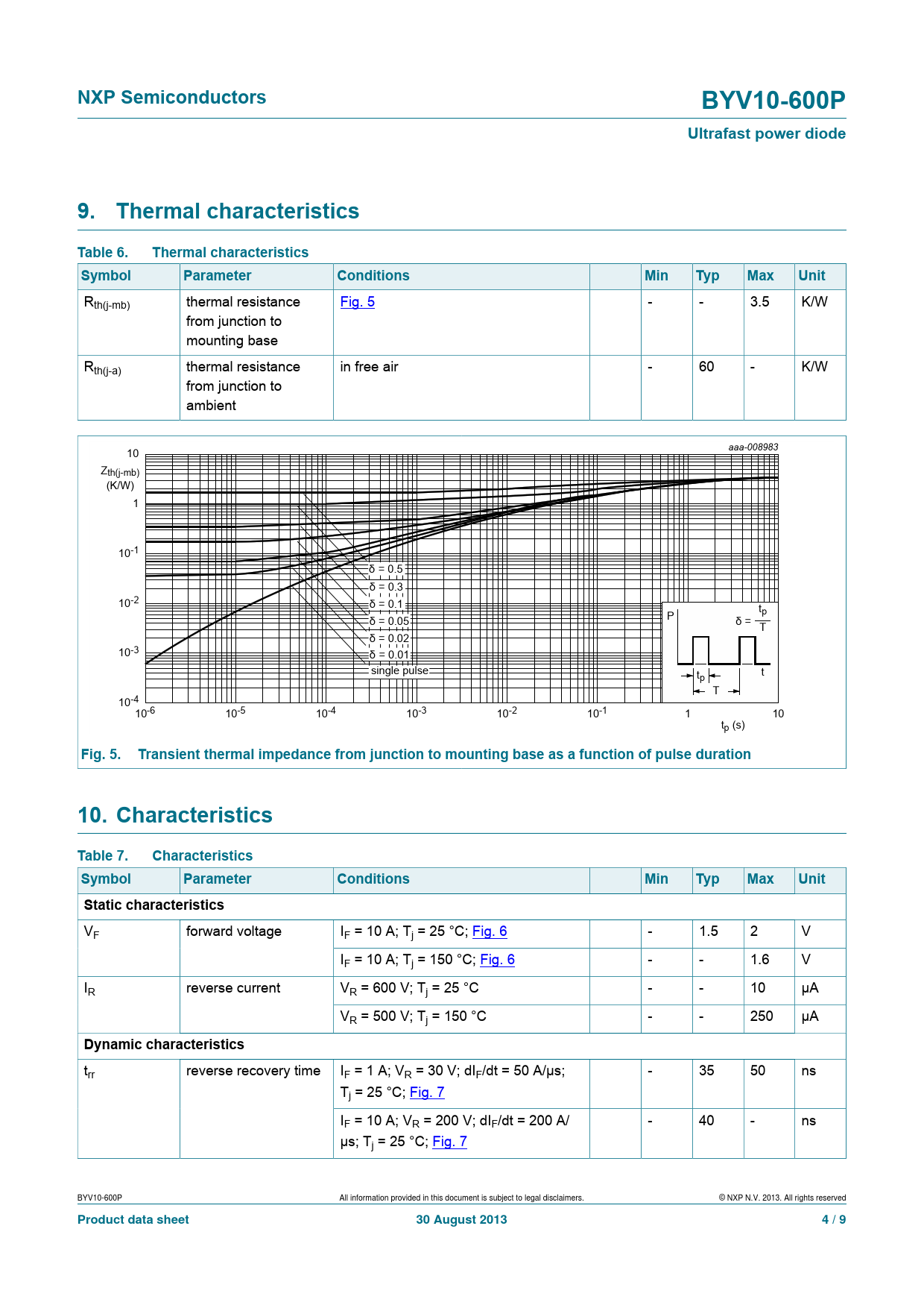NXP Semiconductors. BYV10-600P. Ultrafast power diode. 9. Thermal characteristics. Table 6. Thermal characteristics. Symbol