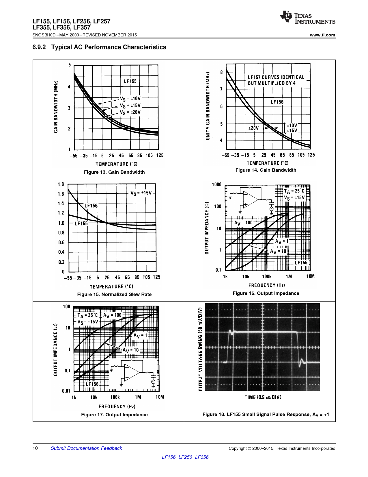 www.ti.com 6.9.2 Typical AC Performance Characteristics Figure 14. Gain Bandwidth Figure 13. Gain Bandwidth Figure 16. Output Impedance Figure 15. Normalized Slew Rate Figure 17. Output Impedance Figure 18. LF155 Small Signal Pulse Response, AV = +1