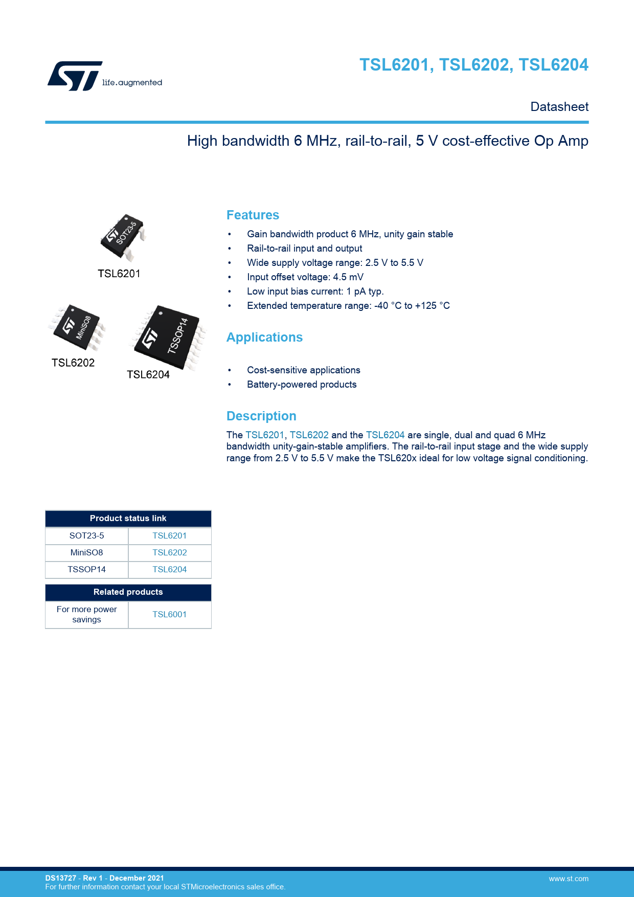 TSL6201, TSL6202, TSL6204. Features. Applications. Description. Product status link. Related products. DS13727. Rev 1. December 2021