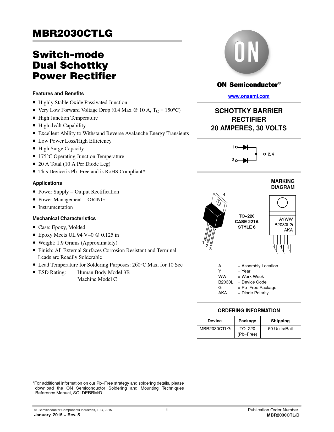 MBR2030CTLG TO−220 50 Units/Rail (Pb−Free) *For additional information on our Pb−Free strategy and soldering details, please download the ON Semiconductor Soldering and Mounting Techniques Reference Manual, SOLDERRM/D. © Semiconductor Components Industries, LLC, 2015