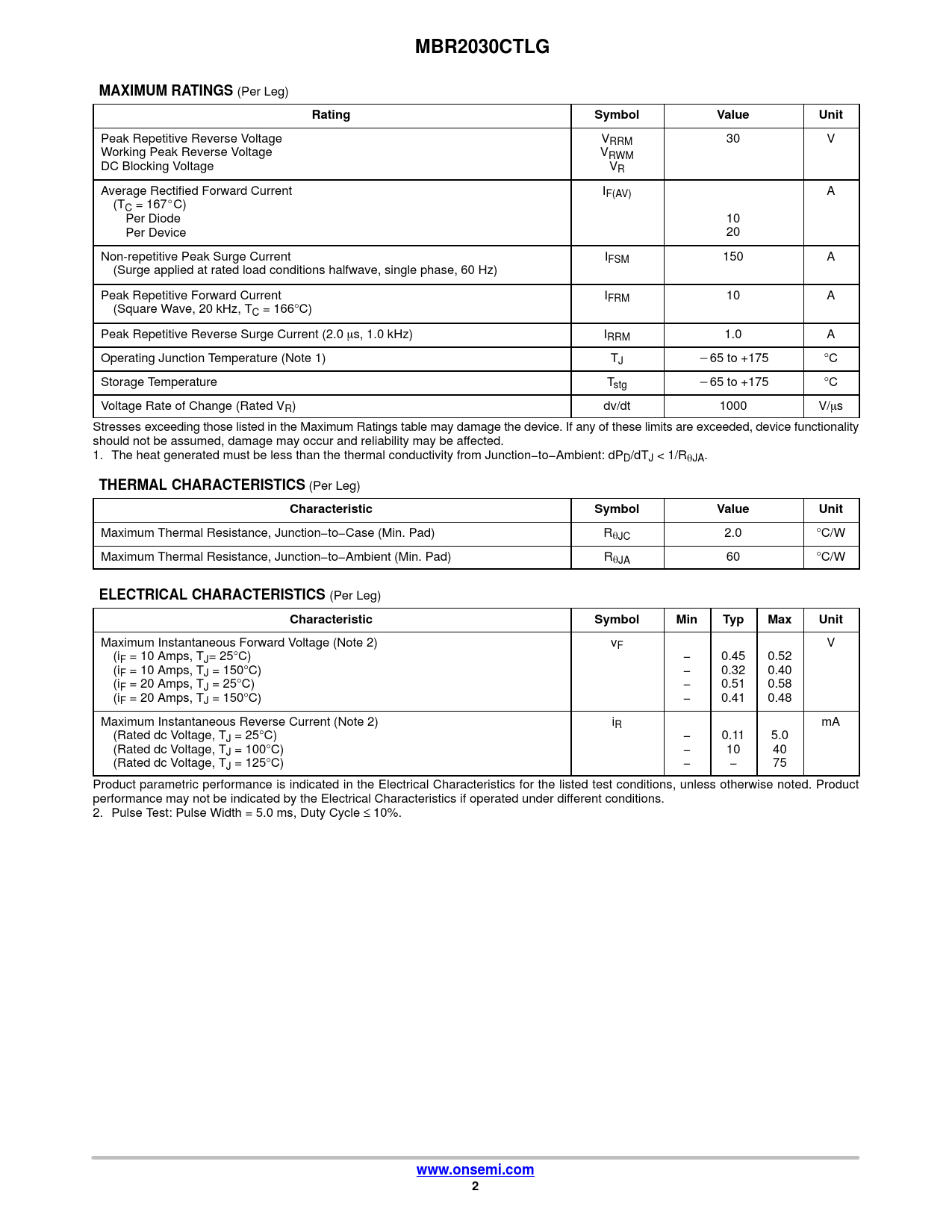 Peak Repetitive Reverse Voltage VRRM 30 V Working Peak Reverse Voltage VRWM DC Blocking Voltage VR Average Rectified Forward Current IF(AV) A (TC = 167_C) Per Diode 10 Per Device 20 Non-repetitive Peak Surge Current IFSM 150 A (Surge applied at rated load conditions halfwave, single phase, 60 Hz) Peak Repetitive Forward Current IFRM 10 A (Square Wave, 20 kHz, TC = 166°C) Peak Repetitive Reverse Surge Current (2.0 ms, 1.0 kHz) IRRM 1.0 A Operating Junction Temperature (Note 1) TJ *65 to +175 °C Storage Temperature Tstg *65 to +175 °C Voltage Rate of Change (Rated VR) dv/dt 1000 V/ms Stresses exceeding those listed in the Maximum Ratings table may damage the device. If any of these limits are exceeded, device functionality should not be assumed, damage may occur and reliability may be affected. 1. The heat generated must be less than the thermal conductivity from Junction−to−Ambient: dPD/dTJ < 1/RqJA.