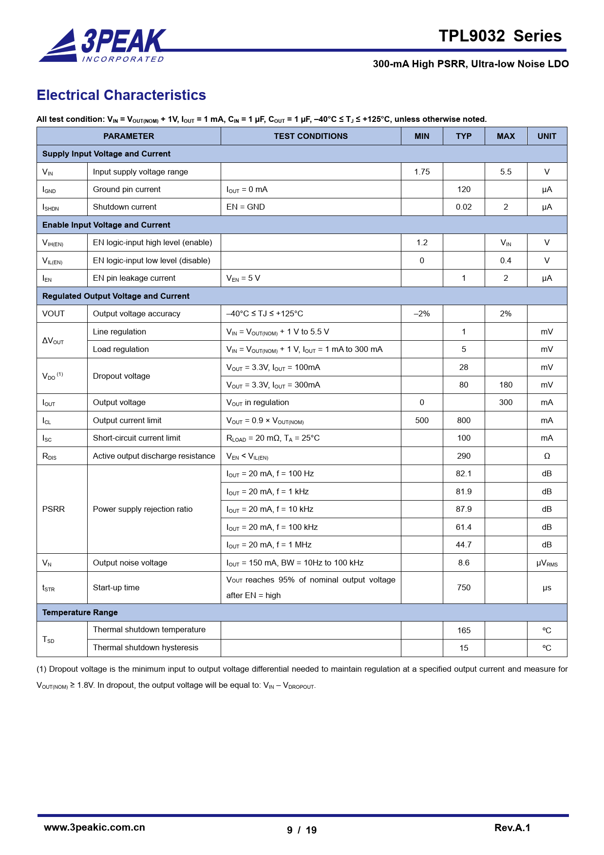 TPL9032 Series300-mA High PSRR, Ultra-low Noise LDOElectrical CharacteristicsAll test condition: VIN = VOUT(NOM) + 1V, IOUT = 1 mA, CIN = 1 µF, COUT = 1 µF, –40°C ≤ TJ ≤ +125°C, unless otherwise noted.PARAMETERTEST CONDITIONSMINTYPMAXUNITSupply Input Voltage and Current VIN Input supply voltage range 1.75 5.5 V IGND Ground pin current IOUT = 0 mA 120 µA ISHDN Shutdown current EN = GND 0.02 2 µA Enable Input Voltage and Current VIH(EN) EN logic-input high level (enable) 1.2 VIN V VIL(EN) EN logic-input low level (disable) 0 0.4 V IEN EN pin leakage current VEN = 5 V 1 2 µA Regulated Output Voltage and Current VOUT Output voltage accuracy –40°C ≤ TJ ≤ +125°C –2% 2% Line regulation VIN = VOUT(NOM) + 1 V to 5.5 V 1 mV ΔVOUT Load regulation VIN = VOUT(NOM) + 1 V, IOUT = 1 mA to 300 mA 5 mV VOUT = 3.3V, IOUT = 100mA 28 mV V (1) DO Dropout voltage VOUT = 3.3V, IOUT = 300mA 80 180 mV IOUT Output voltage VOUT in regulation 0 300 mA ICL Output current limit VOUT = 0.9 × VOUT(NOM) 500 800 mA ISC Short-circuit current limit RLOAD = 20 mΩ, TA = 25°C 100 mA RDIS Active output discharge resistance VEN < VIL(EN) 290 Ω IOUT = 20 mA, f = 100 Hz 82.1 dB IOUT = 20 mA, f = 1 kHz 81.9 dB PSRR Power supply rejection ratio IOUT = 20 mA, f = 10 kHz 87.9 dB IOUT = 20 mA, f = 100 kHz 61.4 dB IOUT = 20 mA, f = 1 MHz 44.7 dB VN Output noise voltage IOUT = 150 mA, BW = 10Hz to 100 kHz 8.6 μVRMS VOUT reaches 95% of nominal output voltage tSTR Start-up time 750 μs after EN = high Temperature Range Thermal shutdown temperature 165 ºC TSD Thermal shutdown hysteresis 15 ºC (1) Dropout voltage is the minimum input to output voltage differential needed to maintain regulation at a specified output current and measure for VOUT(NOM) ≥ 1.8V. In dropout, the output voltage will be equal to: VIN – VDROPOUT. www.3peakic.com.cnRev.A.19 / 19