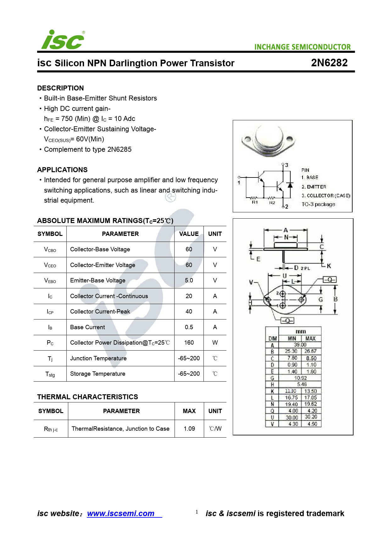 isc Silicon NPN Darlingtion Power Transistor2N6282DESCRIPTION ·Built-in Base-Emitter Shunt Resistors ·High DC current gain- hFE = 750 (Min) @ IC = 10 Adc ·Col ector-Emitter Sustaining Voltage- VCEO(SUS)= 60V(Min) ·Complement to type 2N6285 APPLICATIONS ·Intended for general purpose amplifier and low frequency switching applications, such as linear and switching indu- strial equipment. ABSOLUTE MAXIMUM RATINGS(TC=25 ℃ )SYMBOLPARAMETERVALUEUNIT VCBO Col ector-Base Voltage 60 V VCEO Col ector-Emitter Voltage 60 V VEBO Emitter-Base Voltage 5.0 V IC Col ector Current -Continuous 20 A ICP Col ector Current-Peak 40 A IB Base Current 0.5 A PC Col ector Power Dissipation@TC=25℃ 160 W Tj Junction Temperature -65~200 ℃ Tstg Storage Temperature -65~200 ℃ THERMAL CHARACTERISTICSSYMBOLPARAMETERMAXUNIT Rth j-c ThermalResistance, Junction to Case 1.09 ℃/W isc website : www.iscsemi.com 1 isc & iscsemiis registered trademark Document Outline isc Silicon NPN Darlingtion Power Transistor DESCRIPTION APPLICATIONS ABSOLUTE MAXIMUM RATINGS(TC=25℃) THERMAL CHARACTERISTICS isc Silicon NPN Darlingtion Power Transistor ELECTRICAL CHARACTERISTICS