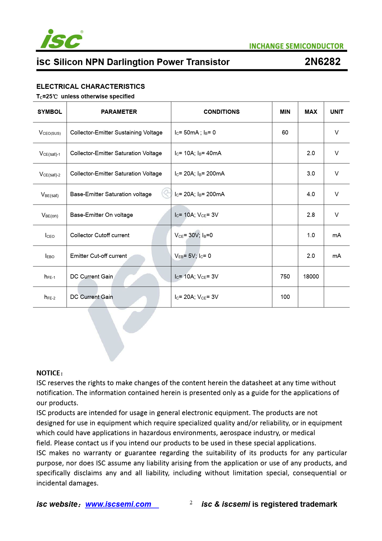 isc Silicon NPN Darlingtion Power Transistor2N6282ELECTRICAL CHARACTERISTICS TC=25 ℃ unless otherwise specifiedSYMBOLPARAMETERCONDITIONSMINMAXUNIT VCEO(SUS) Col ector-Emitter Sustaining Voltage IC= 50mA ; IB= 0 60 V VCE(sat)-1 Col ector-Emitter Saturation Voltage IC= 10A; IB= 40mA 2.0 V VCE(sat)-2 Col ector-Emitter Saturation Voltage IC= 20A; IB= 200mA 3.0 V VBE(sat) Base-Emitter Saturation voltage IC= 20A; IB= 200mA 4.0 V VBE(on) Base-Emitter On voltage IC= 10A; VCE= 3V 2.8 V ICEO Col ector Cutoff current VCE= 30V; IB=0 1.0 mA IEBO Emitter Cut-off current VEB= 5V; IC= 0 2.0 mA hFE-1 DC Current Gain IC= 10A; VCE= 3V 750 18000 hFE-2 DC Current Gain IC= 20A; VCE= 3V 100 NOTICE : ISC reserves the rights to make changes of the content herein the datasheet at any time without notification. The information contained herein is presented only as a guide for the applications of our products. ISC products are intended for usage in general electronic equipment. The products are not designed for use in equipment which require specialized quality and/or reliability, or in equipment which could have applications in hazardous environments, aerospace industry, or medical field. Please contact us if you intend our products to be used in these special applications. ISC makes no warranty or guarantee regarding the suitability of its products for any particular purpose, nor does ISC assume any liability arising from the application or use of any products, and specifical y disclaims any and al liability, including without limitation special, consequential or incidental damages. isc website : www.iscsemi.com 2 isc & iscsemiis registered trademark Document Outline isc Silicon NPN Darlingtion Power Transistor DESCRIPTION APPLICATIONS ABSOLUTE MAXIMUM RATINGS(TC=25℃) THERMAL CHARACTERISTICS isc Silicon NPN Darlingtion Power Transistor ELECTRICAL CHARACTERISTICS
