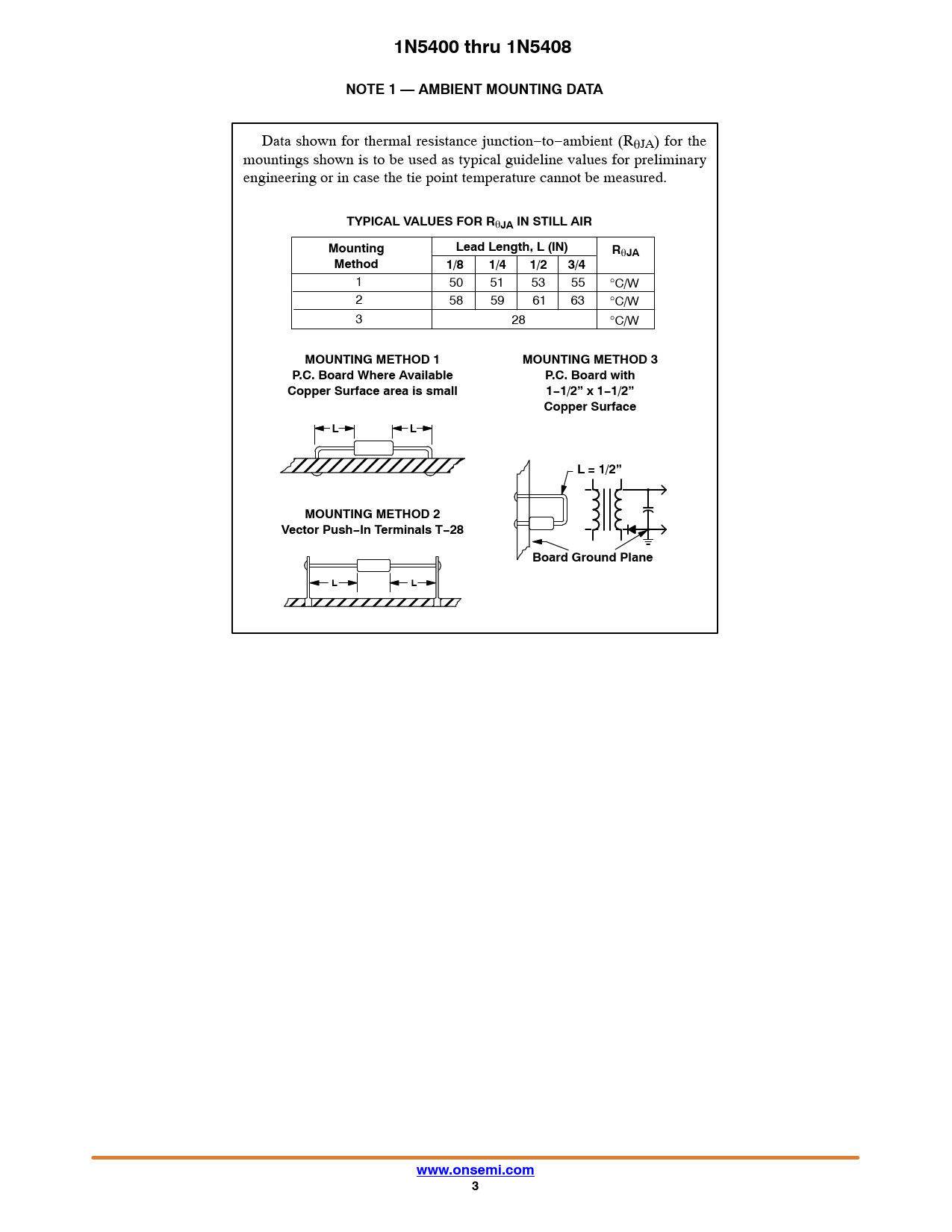 1N5400 thru 1N5408. NOTE 1 — AMBIENT MOUNTING DATA. TYPICAL VALUES FOR. JA IN STILL AIR. Mounting. Lead Length, L (IN). Method. 1/8