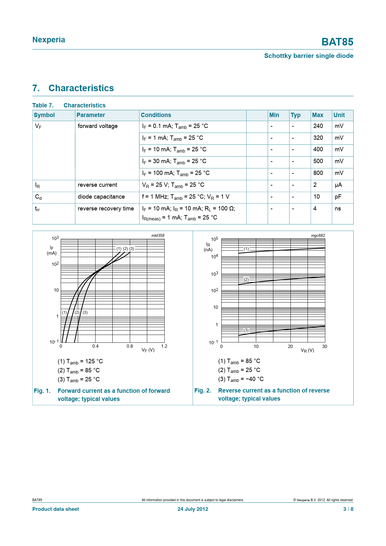 | Seiten / Seite | 8 / 3 — Nexperia. BAT85. Schottky barrier single diode. 7. Characteristics. Table … |