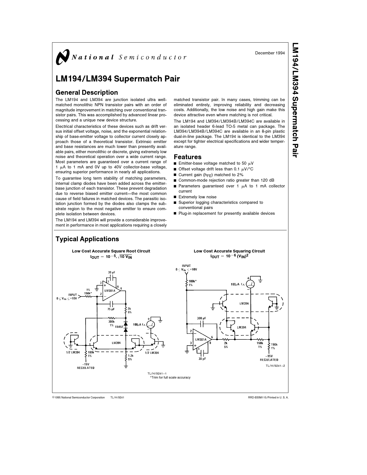 LM194/LM394. December. 1994. LM194/LM394. Supermatch. Pair. General. Description. Supermatch. The. LM194. and. LM394. are. junction. isolated. ultra