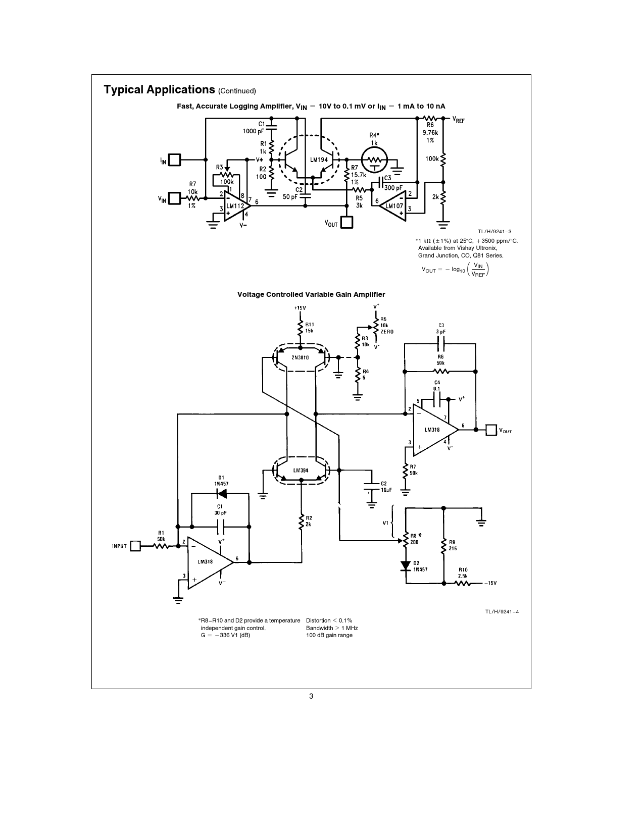Typical Applications (Continued) Fast, Accurate Logging Amplifier, VIN e 10V to 0.1 mV or IIN e 1 mA to 10 nA TL/H/9241 – 3 *1 kX (g1%) at 25§C, a3500 ppm/§C. Available from Vishay Ultronix, Grand Junction, CO, Q81 Series. VOUT e b log10 # VIN V J REF Voltage Controlled Variable Gain Amplifier TL/H/9241 – 4 *R8–R10 and D2 provide a temperature Distortion k 0.1% independent gain control. Bandwidth l 1 MHz G e b336 V1 (dB) 100 dB gain range 3
