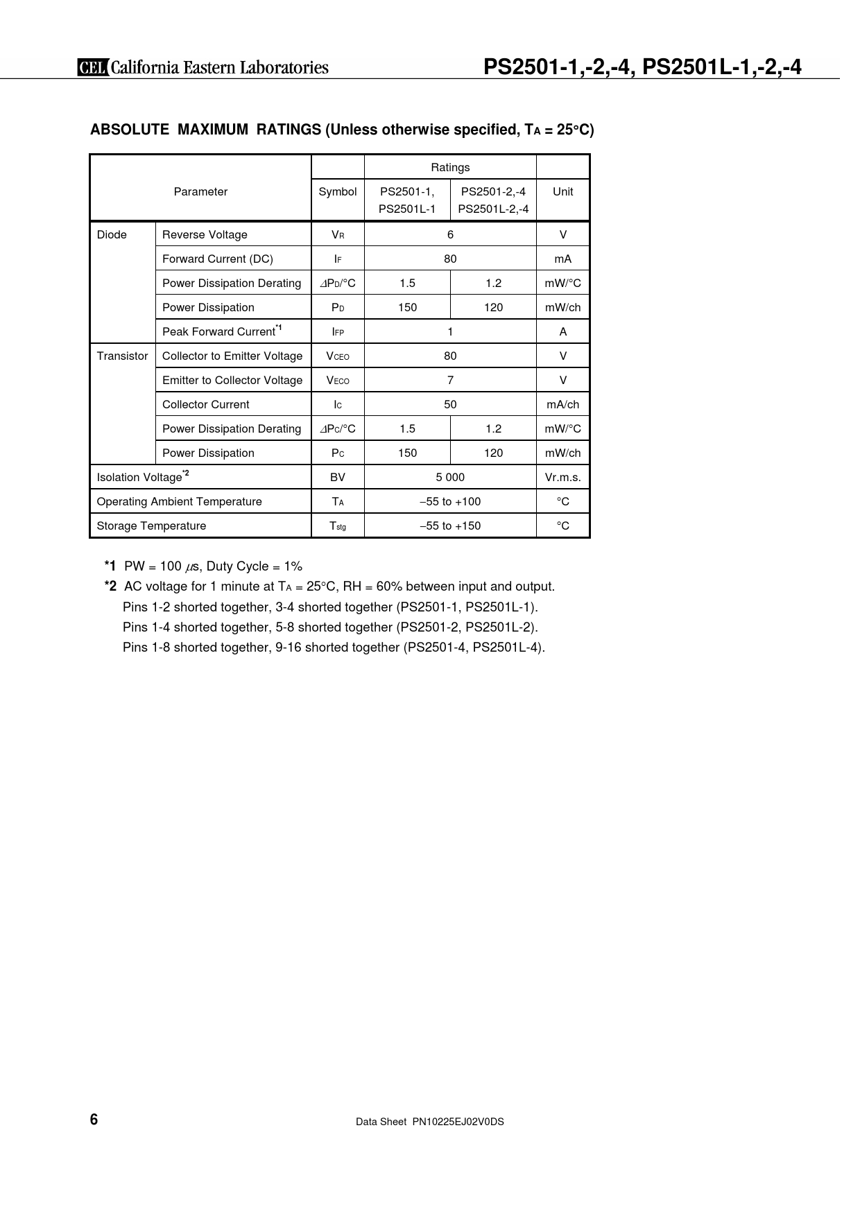 PS2501-1,-2,-4, PS2501L-1,-2,-4ABSOLUTE MAXIMUM RATINGS (Unless otherwise specified, TA = 25 ° C) Ratings Parameter Symbol PS2501-1, PS2501-2,-4 Unit PS2501L-1 PS2501L-2,-4 Diode Reverse Voltage VR 6 V Forward Current (DC) IF 80 mA Power Dissipation Derating ∆PD/°C 1.5 1.2 mW/°C Power Dissipation PD 150 120 mW/ch Peak Forward Current *1 IFP 1 A Transistor Collector to Emitter Voltage VCEO 80 V Emitter to Collector Voltage VECO 7 V Collector Current IC 50 mA/ch Power Dissipation Derating ∆PC/°C 1.5 1.2 mW/°C Power Dissipation PC 150 120 mW/ch Isolation Voltage *2 BV 5 000 Vr.m.s. Operating Ambient Temperature TA −55 to +100 °C Storage Temperature Tstg −55 to +150 °C *1 PW = 100 µs, Duty Cycle = 1% *2 AC voltage for 1 minute at TA = 25°C, RH = 60% between input and output. Pins 1-2 shorted together, 3-4 shorted together (PS2501-1, PS2501L-1). Pins 1-4 shorted together, 5-8 shorted together (PS2501-2, PS2501L-2). Pins 1-8 shorted together, 9-16 shorted together (PS2501-4, PS2501L-4). 6 Data Sheet PN10225EJ02V0DS