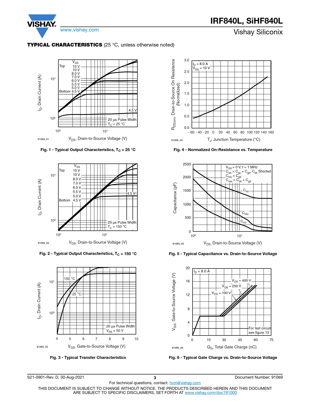 IRF840L, SiHF840L www.vishay.com Vishay Siliconix TYPICAL CHARACTERISTICS (25 °C, unless otherwise noted) V 3.0 GS I = 8.0 A Top 15 V D V = 10 V 10 V GS 2.5 8.0 V 7.0 V 101 6.0 V 5.5 V 2.0 5.0 V ed) Bottom 4.5 V 1.5 maliz ain Current (A) , Dr (Nor 1.0 I D 4.5 V ain-to-Source On Resistance , Dr 0.5 100 20 µs Pulse Width T = 25 °C C DS(on) 0.0 R 100 101 - 60 - 40 - 20 0 20 40 60 80 100 120 140 160 91069_01 VDS, Drain-to-Source Voltage (V) 91069_04 TJ, Junction Temperature (°C) Fig. 1 - Typical Output Characteristics, TC = 25 °CFig. 4 - Normalized On-Resistance vs. Temperature V 2500 GS VGS = 0 V, f = 1 MHz Top 15 V C = C + C , C Shorted iss gs gd ds 101 10 V 2000 C = C rss gd 8.0 V C = C + C oss ds gd 7.0 V 6.0 V C 5.5 V 1500 iss 4.5 V 5.0 V Bottom 4.5 V ain Current (A) 1000 , Dr Capacitance (pF) I D Coss 500 100 20 µs Pulse Width Crss T = 150 °C C 0 100 101 100 101 91069_02 VDS, Drain-to-Source Voltage (V) 91069_05 VDS, Drain-to-Source Voltage (V) Fig. 2 - Typical Output Characteristics, TC = 150 °CFig. 5 - Typical Capacitance vs. Drain-to-Source Voltage 20 I = 8.0 A D 150 °C 101 16 V = 400 V DS ltage (V) V = 250 V o DS V 25 °C V = 100 V 12 DS ain Current (A) 8 100 , Dr I D , Gate-to-Source 4 20 µs Pulse Width GS For test circuit V = 50 V V DS see figure 13 0 4 5 6 7 8 9 10 0 15 30 45 60 75 91069_03 VGS, Gate-to-Source Voltage (V) 91069_06 QG, Total Gate Charge (nC) Fig. 3 - Typical Transfer CharacteristicsFig. 6 - Typical Gate Charge vs. Drain-to-Source Voltage S21-0901-Rev. D, 30-Aug-2021 3 Document Number: 91069 For technical questions, contact: hvm@vishay.com THIS DOCUMENT IS SUBJECT TO CHANGE WITHOUT NOTICE. THE PRODUCTS DESCRIBED HEREIN AND THIS DOCUMENT ARE SUBJECT TO SPECIFIC DISCLAIMERS, SET FORTH AT www.vishay.com/doc?91000