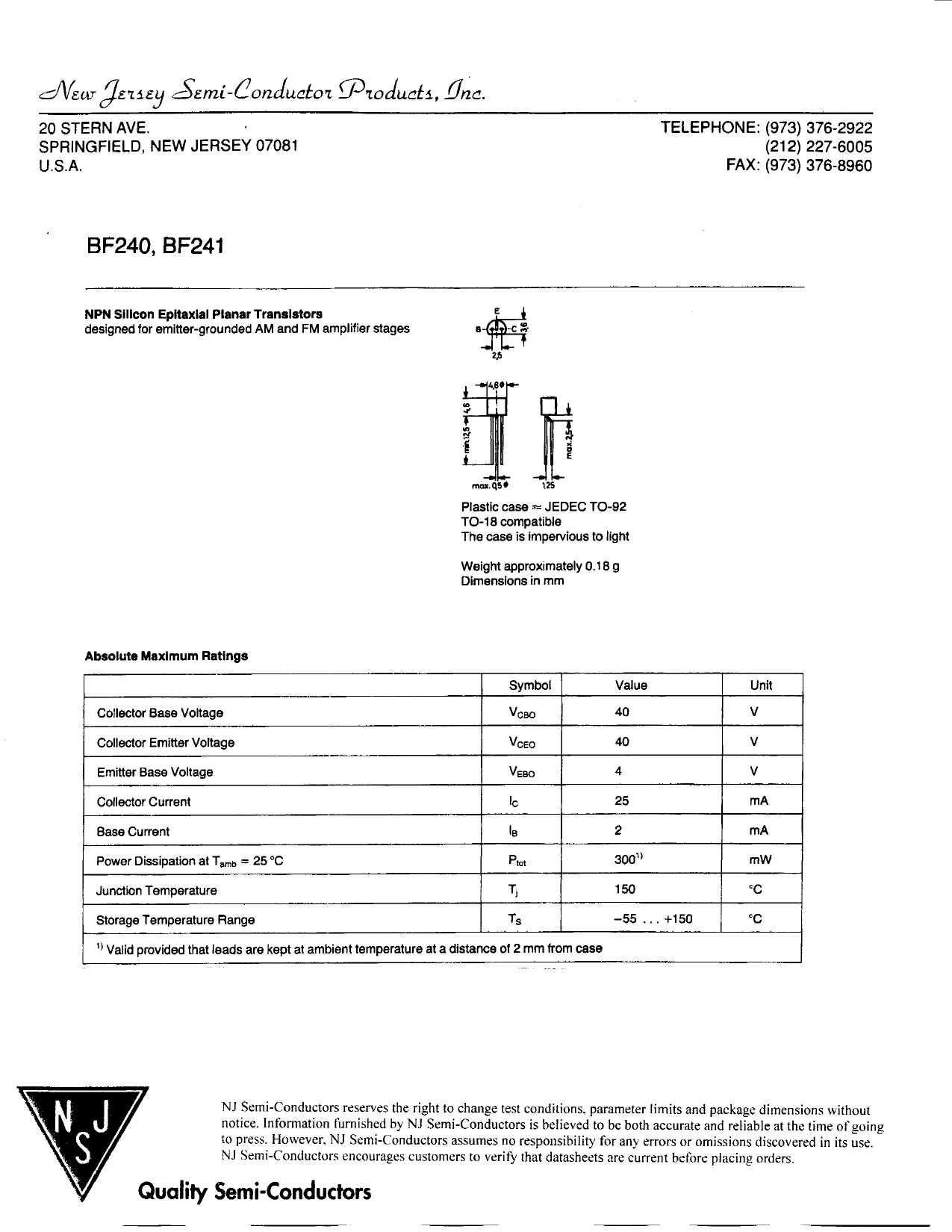 Datasheet BF240, BF241 New Jersey Semiconductor