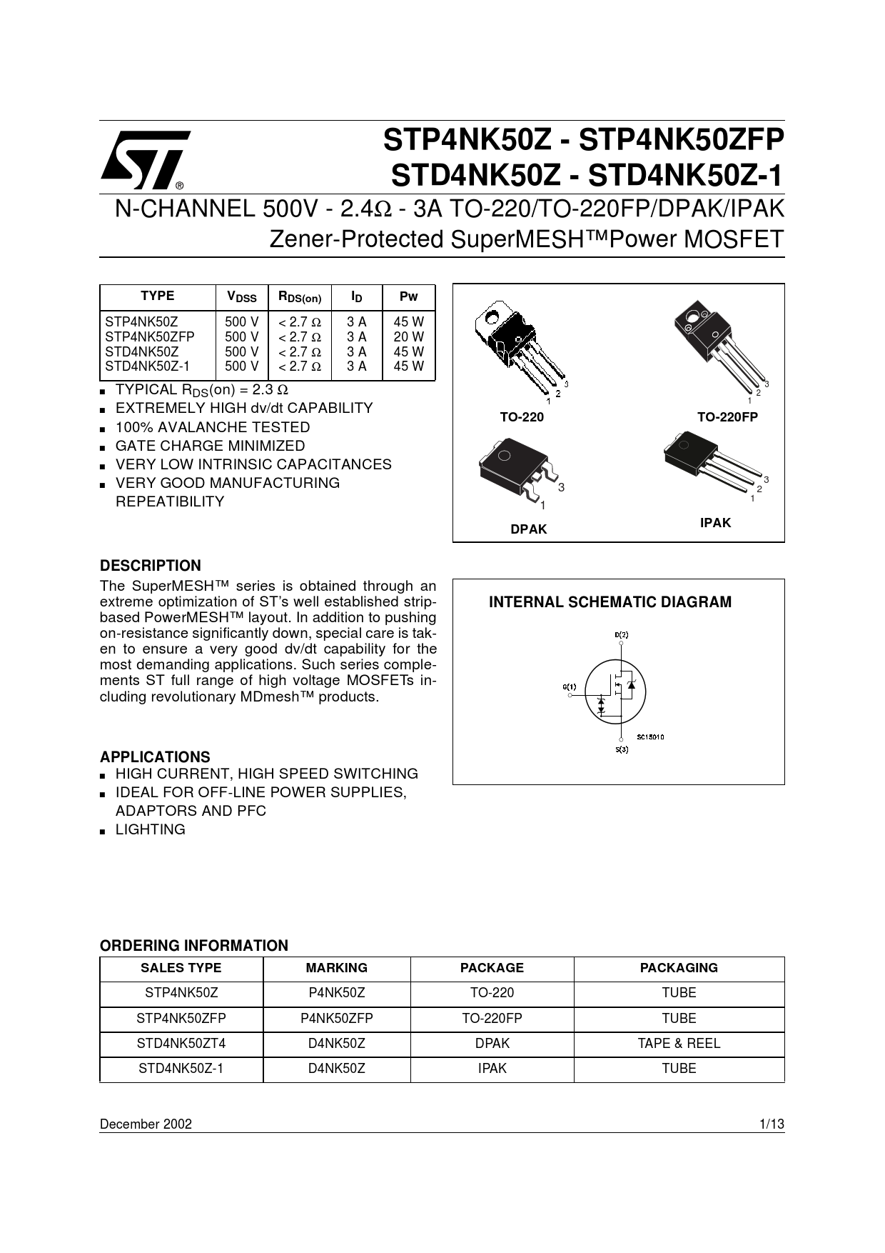 STP4NK50Z P4NK50Z TO-220 TUBE STP4NK50ZFP P4NK50ZFP TO-220FP TUBE STD4NK50ZT4 D4NK50Z DPAK TAPE & REEL STD4NK50Z-1 D4NK50Z IPAK TUBE December 2002 1/13
