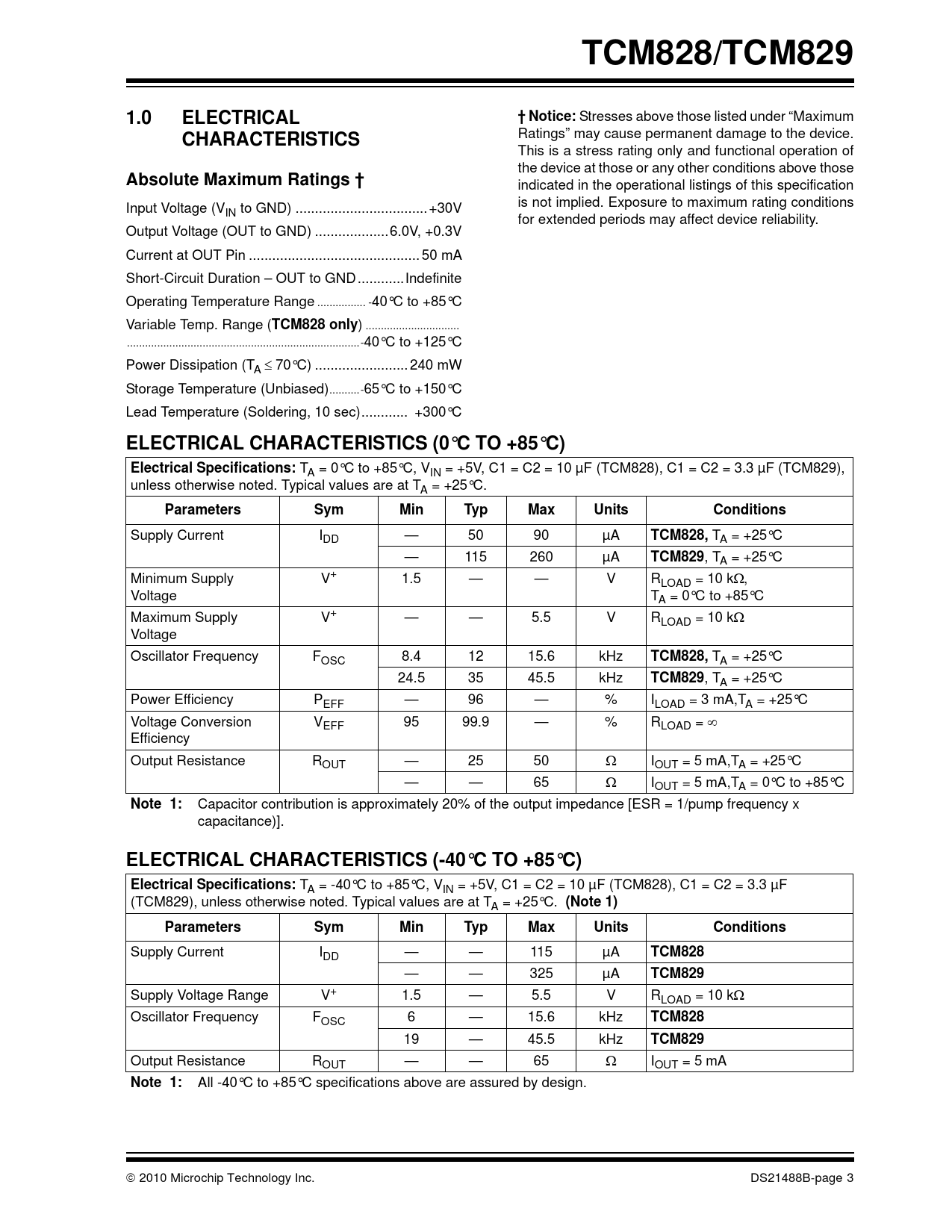 TCM828/TCM829 1.0 ELECTRICAL † Notice: