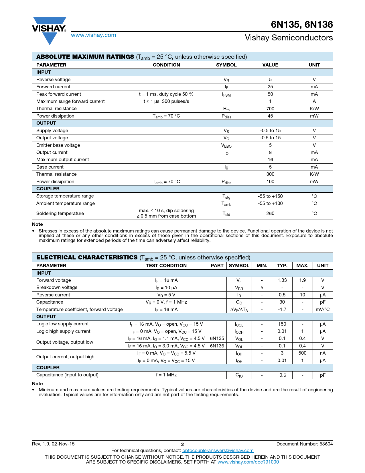 6N135, 6N136 www.vishay.com Vishay Semiconductors ABSOLUTE MAXIMUM RATINGS (Tamb = 25 °C, unless otherwise specified) PARAMETERCONDITIONSYMBOLVALUEUNITINPUT Reverse voltage VR 5 V Forward current IF 25 mA Peak forward current t = 1 ms, duty cycle 50 % IFSM 50 mA Maximum surge forward current t ≤ 1 μs, 300 pulses/s 1 A Thermal resistance Rth 700 K/W Power dissipation Tamb = 70 °C Pdiss 45 mW OUTPUT Supply voltage VS -0.5 to 15 V Output voltage VO -0.5 to 15 V Emitter base voltage VEBO 5 V Output current IO 8 mA Maximum output current 16 mA Base current IB 5 mA Thermal resistance 300 K/W Power dissipation Tamb = 70 °C Pdiss 100 mW COUPLER Storage temperature range Tstg -55 to +150 °C Ambient temperature range Tamb -55 to +100 °C max. ≤ 10 s, dip soldering Soldering temperature ≥ T 0.5 mm from case bottom sld 260 °C Note • Stresses in excess of the absolute maximum ratings can cause permanent damage to the device. Functional operation of the device is not implied at these or any other conditions in excess of those given in the operational sections of this document. Exposure to absolute maximum ratings for extended periods of the time can adversely affect reliability. ELECTRICAL CHARACTERISTICS (Tamb = 25 °C, unless otherwise specified) PARAMETERTEST CONDITIONPARTSYMBOLMIN.TYP.MAX.UNITINPUT Forward voltage IF = 16 mA VF - 1.33 1.9 V Breakdown voltage IR = 10 μA VBR 5 - - V Reverse current VR = 5 V IR - 0.5 10 μA Capacitance VR = 0 V, f = 1 MHz CO - 30 - pF Temperature coefficient, forward voltage IF = 16 mA ΔVF/ΔTA - -1.7 - mV/°C OUTPUT Logic low supply current IF = 16 mA, VO = open, VCC = 15 V ICCL - 150 - μA Logic high supply current IF = 0 mA, VO = open, VCC = 15 V ICCH - 0.01 1 μA IF = 16 mA, IO = 1.1 mA, VCC = 4.5 V 6N135 VOL - 0.1 0.4 V Output voltage, output low IF = 16 mA, IO = 3.0 mA, VCC = 4.5 V 6N136 VOL - 0.1 0.4 V IF = 0 mA, VO = VCC = 5.5 V IOH - 3 500 nA Output current, output high IF = 0 mA, VO = VCC = 15 V IOH - 0.01 1 μA COUPLER Capacitance (input to output) f = 1 MHz CIO - 0.6 - pF Note • Minimum and maximum values are testing requirements. Typical values are characteristics of the device and are the result of engineering evaluation. Typical values are for information only and are not part of the testing requirements. Rev. 1.9, 02-Nov-15 2 Document Number: 83604 For technical questions, contact: optocoupleranswers@vishay.com THIS DOCUMENT IS SUBJECT TO CHANGE WITHOUT NOTICE. THE PRODUCTS DESCRIBED HEREIN AND THIS DOCUMENT ARE SUBJECT TO SPECIFIC DISCLAIMERS, SET FORTH AT www.vishay.com/doc?91000