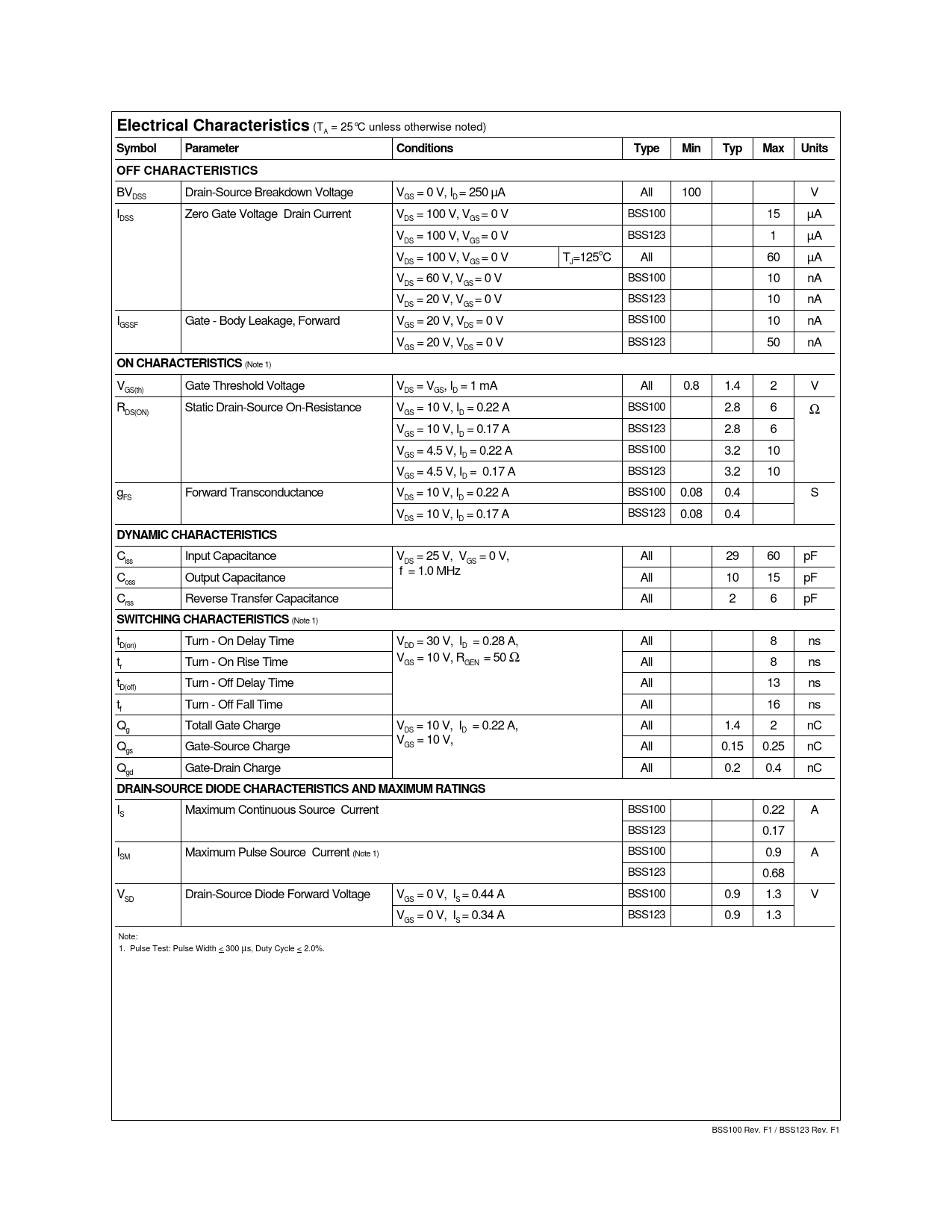 (Note 1) V Gate Threshold Voltage V = V , I = 1 mA All 0.8 1.4 2 V GS(th) DS GS D R Static Drain-Source On-Resistance V = 10 V, I = 0.22 A BSS100 2.8 6 Ω DS(ON) GS D V = 10 V, I = 0.17 A BSS123 2.8 6 GS D V = 4.5 V, I = 0.22 A BSS100 3.2 10 GS D V = 4.5 V, I = 0.17 A BSS123 3.2 10 GS D g Forward Transconductance V = 10 V, I = 0.22 A BSS100 0.08 0.4 S FS DS D V = 10 V, I = 0.17 A BSS123 0.08 0.4 DS D