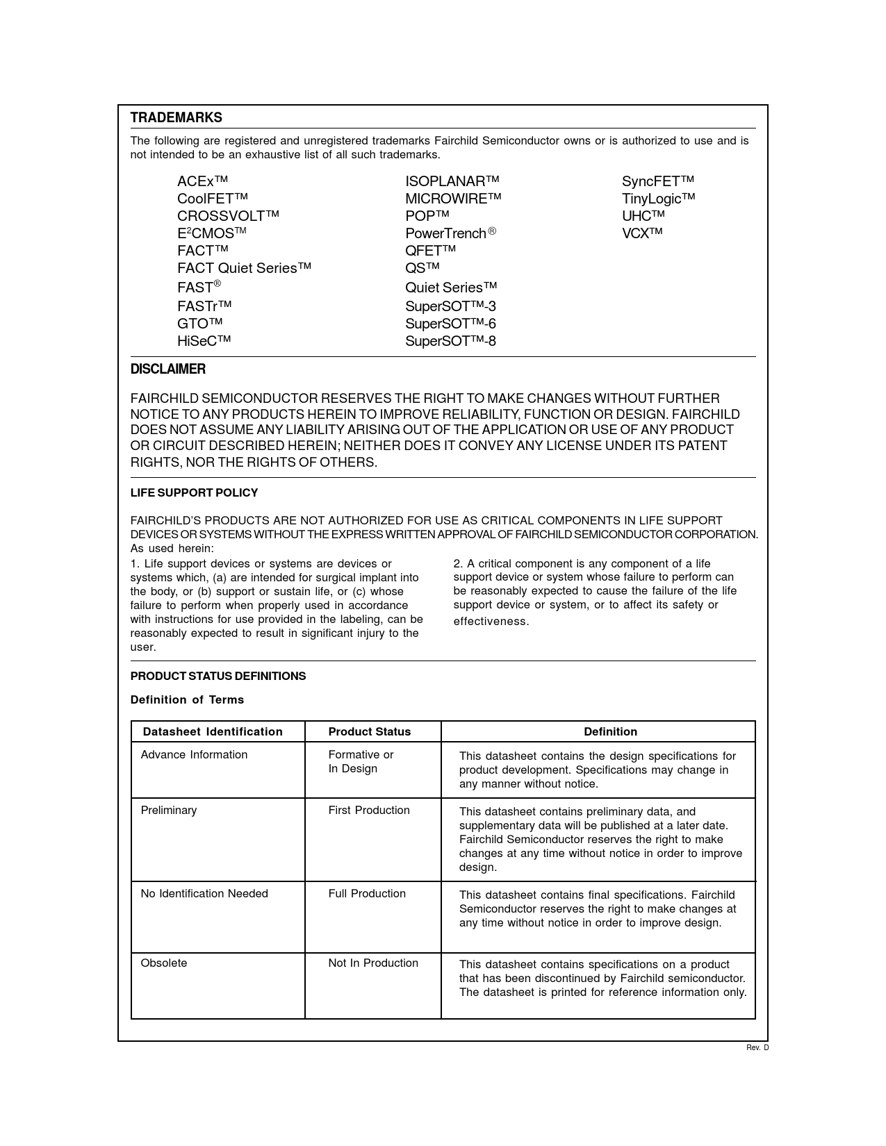 FAIRCHILD SEMICONDUCTOR RESERVES THE RIGHT TO MAKE CHANGES WITHOUT FURTHER NOTICE TO ANY PRODUCTS HEREIN TO IMPROVE RELIABILITY, FUNCTION OR DESIGN. FAIRCHILD DOES NOT ASSUME ANY LIABILITY ARISING OUT OF THE APPLICATION OR USE OF ANY PRODUCT OR CIRCUIT DESCRIBED HEREIN; NEITHER DOES IT CONVEY ANY LICENSE UNDER ITS PATENT RIGHTS, NOR THE RIGHTS OF OTHERS.