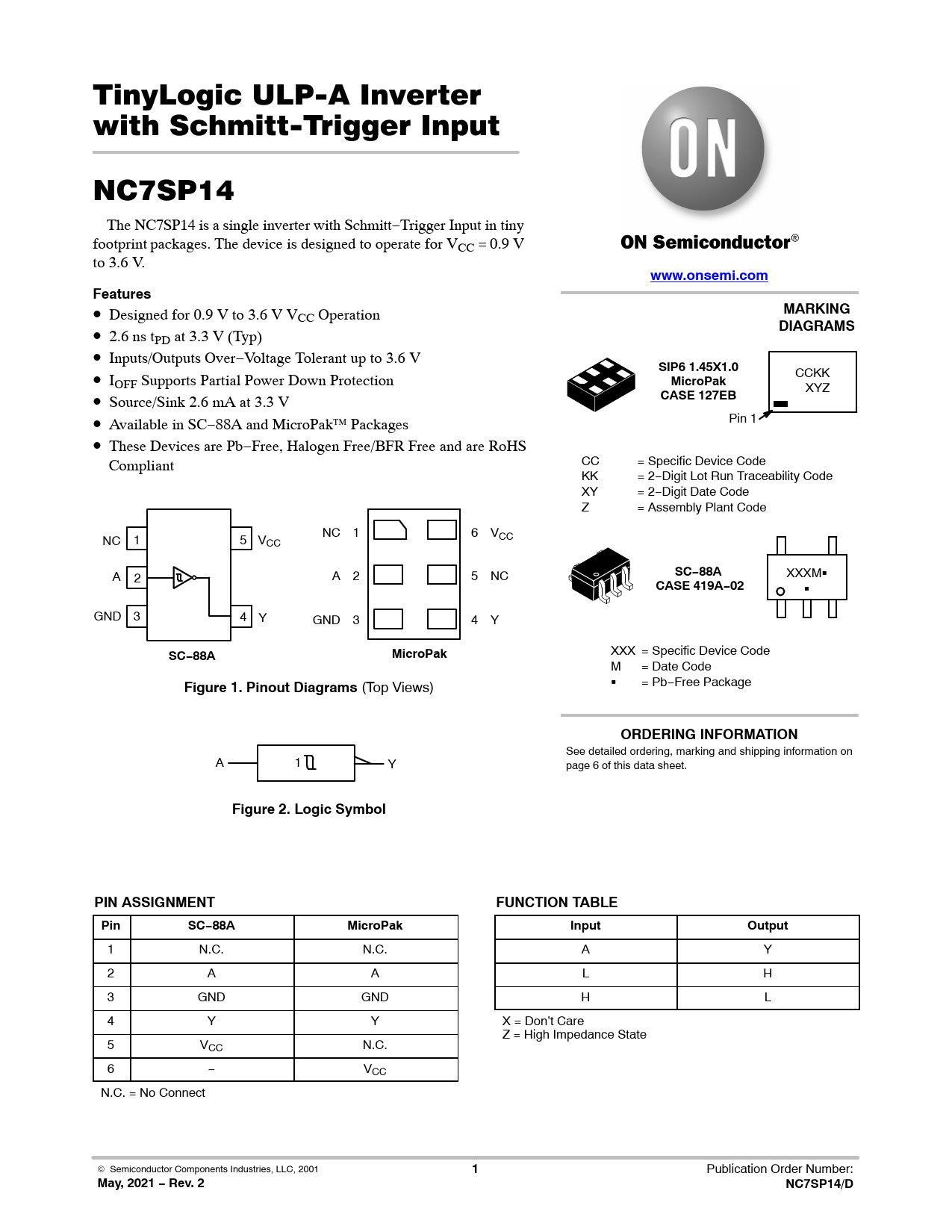 Figure 2. Logic Symbol PIN ASSIGNMENT FUNCTION TABLE Pin SC−88A MicroPak Input Output