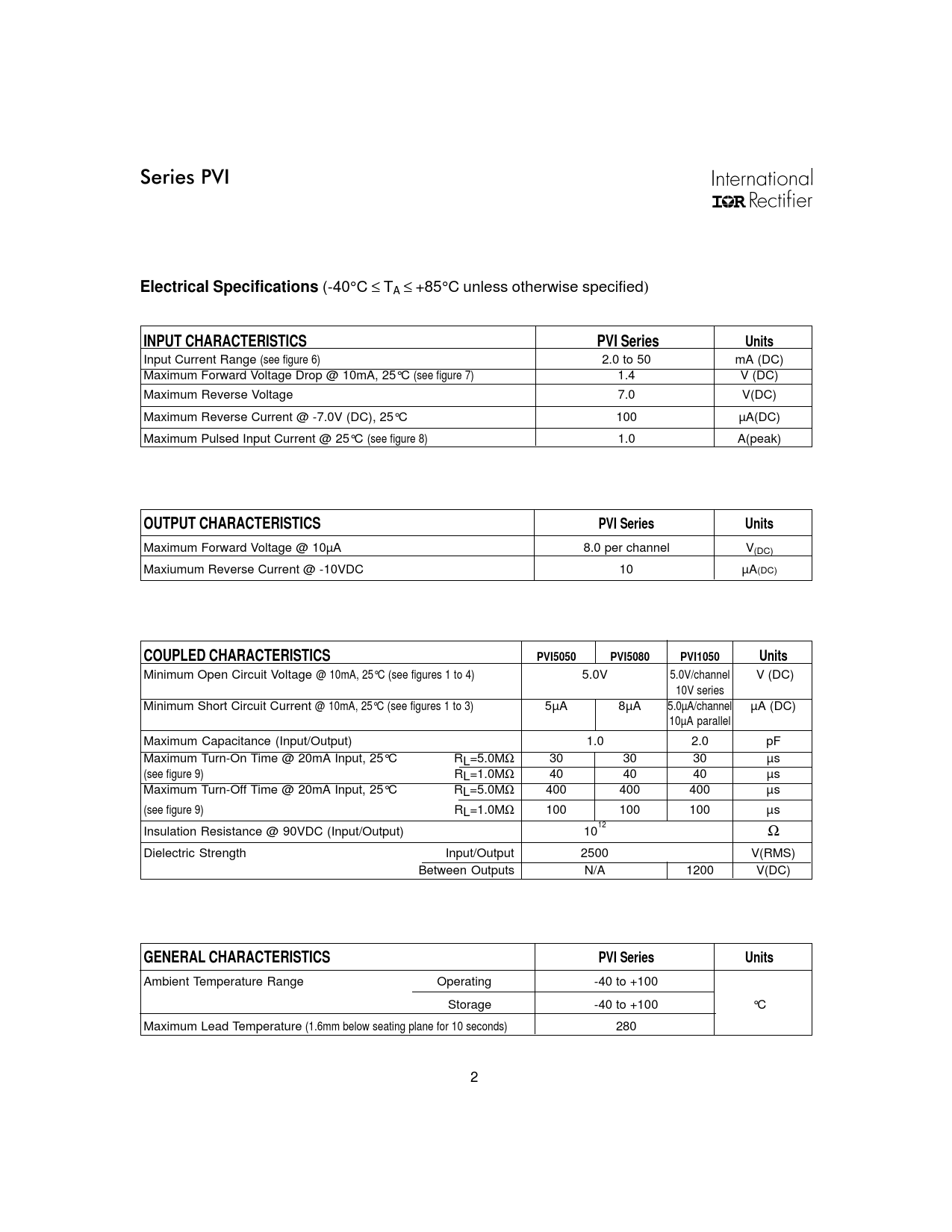 Electrical Specifications. INPUT CHARACTERISTICS. PVI Series. Units. OUTPUT CHARACTERISTICS. COUPLED CHARACTERISTICS. PVI5050
