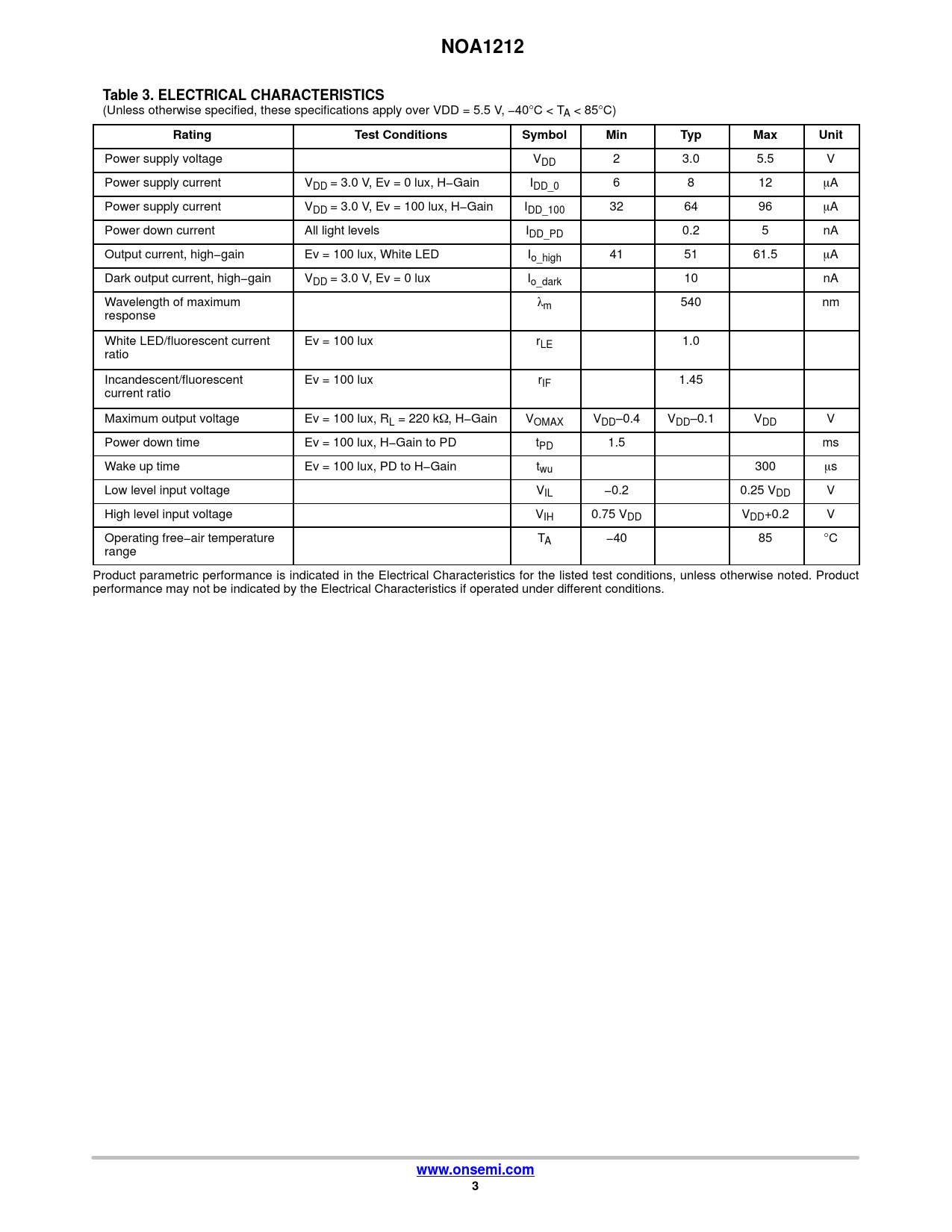 NOA1212Table 3. ELECTRICAL CHARACTERISTICS (Unless otherwise specified, these specifications apply over VDD = 5.5 V, −40°C < TA < 85°C) RatingTest ConditionsSymbolMinTypMaxUnit Power supply voltage VDD 2 3.0 5.5 V Power supply current VDD = 3.0 V, Ev = 0 lux, H−Gain IDD_0 6 8 12 mA Power supply current VDD = 3.0 V, Ev = 100 lux, H−Gain IDD_100 32 64 96 mA Power down current All light levels IDD_PD 0.2 5 nA Output current, high−gain Ev = 100 lux, White LED Io_high 41 51 61.5 mA Dark output current, high−gain VDD = 3.0 V, Ev = 0 lux Io_dark 10 nA Wavelength of maximum lm 540 nm response White LED/fluorescent current Ev = 100 lux rLE 1.0 ratio Incandescent/fluorescent Ev = 100 lux rIF 1.45 current ratio Maximum output voltage Ev = 100 lux, RL = 220 kW, H−Gain VOMAX VDD–0.4 VDD–0.1 VDD V Power down time Ev = 100 lux, H−Gain to PD tPD 1.5 ms Wake up time Ev = 100 lux, PD to H−Gain twu 300 ms Low level input voltage VIL −0.2 0.25 VDD V High level input voltage VIH 0.75 VDD VDD+0.2 V Operating free−air temperature TA −40 85 °C range Product parametric performance is indicated in the Electrical Characteristics for the listed test conditions, unless otherwise noted. Product performance may not be indicated by the Electrical Characteristics if operated under different conditions. www.onsemi.com3
