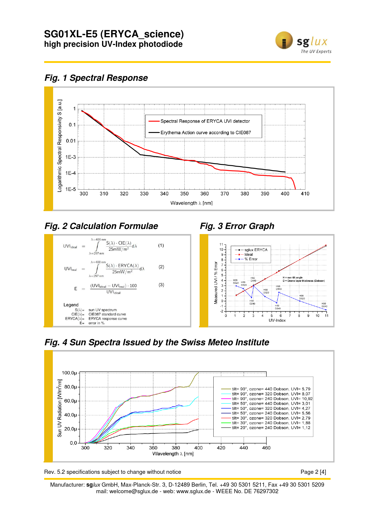 SG01XL-E5 (ERYCA_science) high precision UV-Index photodiode Fig. 1 Spectral Response Fig. 2 Calculation Formulae Fig. 3 Error Graph Fig. 4 Sun Spectra Issued by the Swiss Meteo Institute