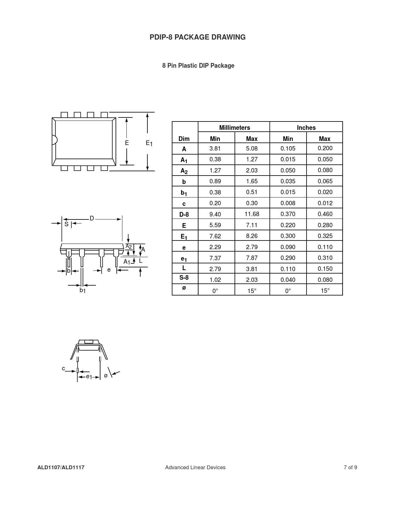 PDIP-8 PACKAGE DRAWING. 8 Pin Plastic DIP Package. Millimeters. Inches. Dim. Min. Max. D-8. S-8. ALD1107/ALD1117