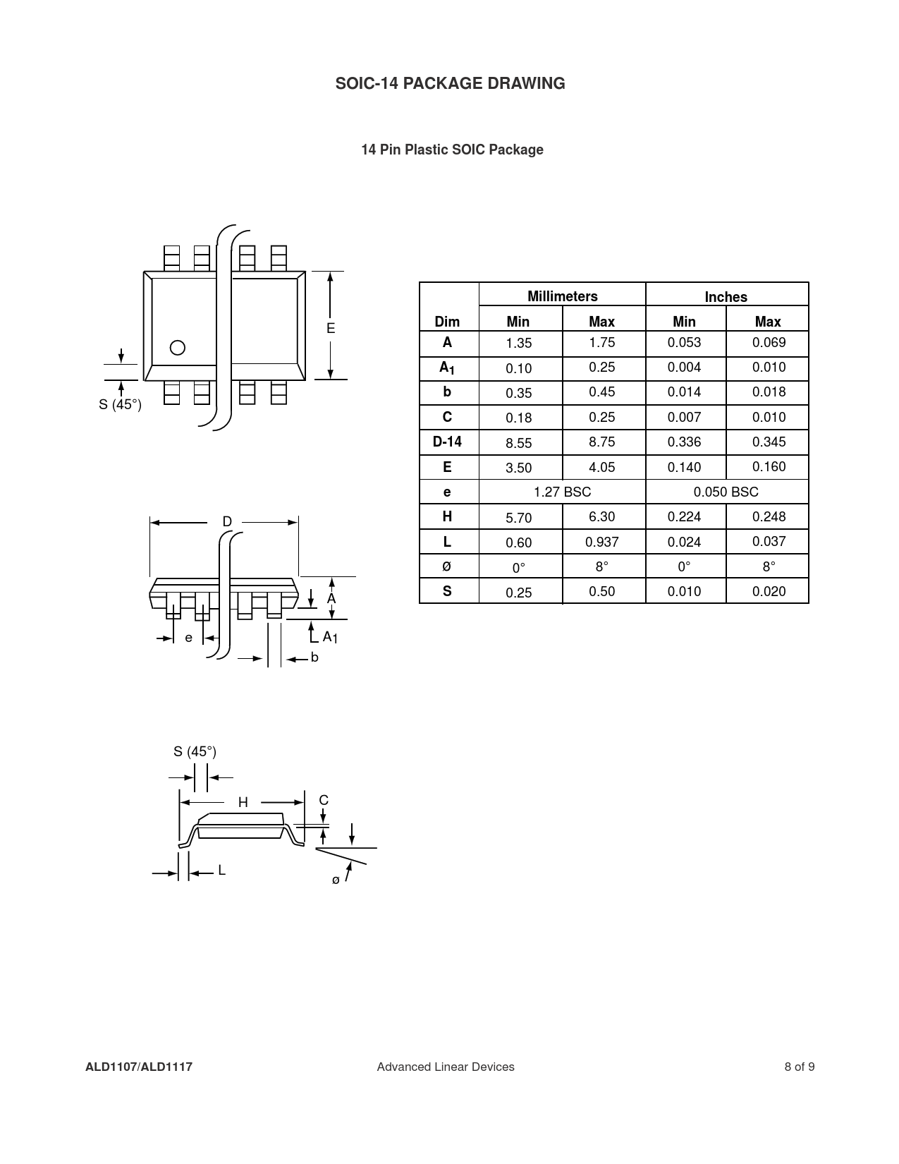SOIC-14 PACKAGE DRAWING. 14 Pin Plastic SOIC Package. Millimeters. Inches. Dim. Min. Max. D-14. ALD1107/ALD1117