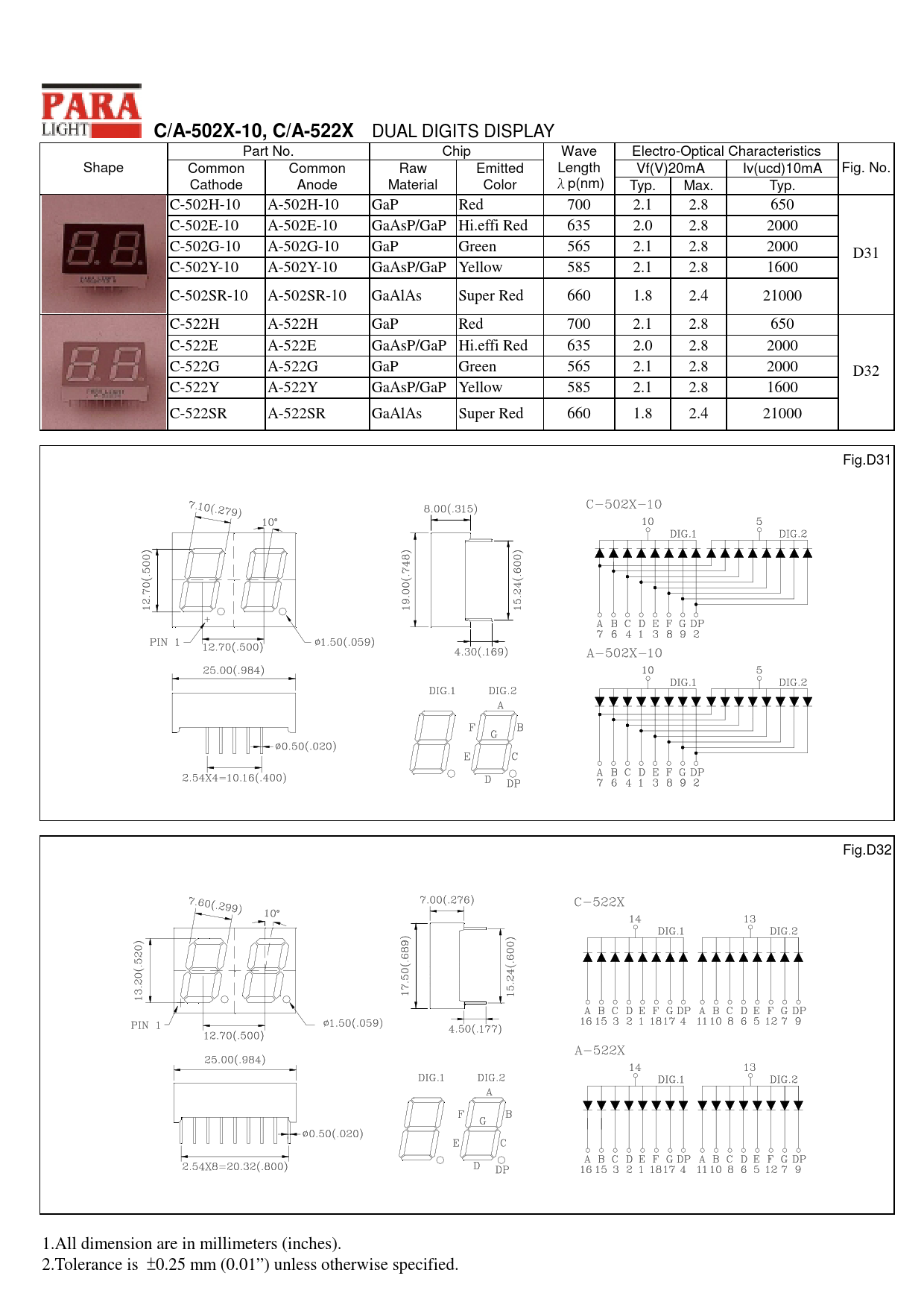 DUAL DIGITS DISPLAY Part No. Chip Wave Electro-Optical Characteristics Shape Common Common Raw Emitted Length Vf(V)20mA Iv(ucd)10mA Fig. No. Cathode Anode Material Color λp(nm) Typ. Max. Typ. C-502H-10 A-502H-10 GaP Red 700 2.1 2.8 650 C-502E-10 A-502E-10 GaAsP/GaP Hi.effi Red 635 2.0 2.8 2000 C-502G-10 A-502G-10 GaP Green 565 2.1 2.8 2000 D31 C-502Y-10 A-502Y-10 GaAsP/GaP Yellow 585 2.1 2.8 1600 C-502SR-10 A-502SR-10 GaAlAs Super Red 660 1.8 2.4 21000 C-522H A-522H GaP Red 700 2.1 2.8 650 C-522E A-522E GaAsP/GaP Hi.effi Red 635 2.0 2.8 2000 C-522G A-522G GaP Green 565 2.1 2.8 2000 D32 C-522Y A-522Y GaAsP/GaP Yellow 585 2.1 2.8 1600 C-522SR A-522SR GaAlAs Super Red 660 1.8 2.4 21000 Fig.D31 Fig.D32 1.All dimension are in millimeters (inches). 2.Tolerance is ±0.25 mm (0.01”) unless otherwise specified.