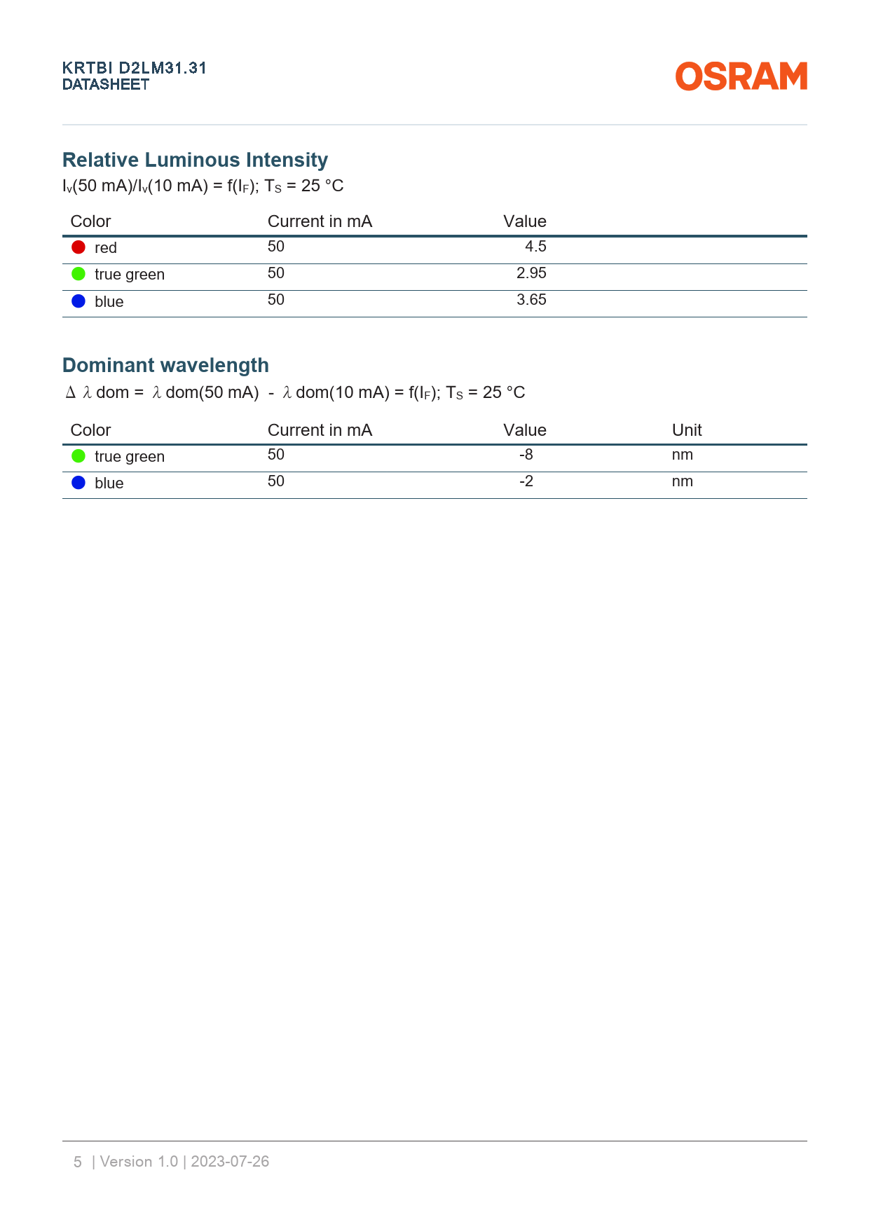 Δλdom = λdom(50 mA) - λdom(10 mA) = f(IF); TS = 25 °C Color Current in mA Value Unit ● true green 50 -8 nm ● blue 50 -2 nm 5 | Version 1.0 | 2023-07-26
