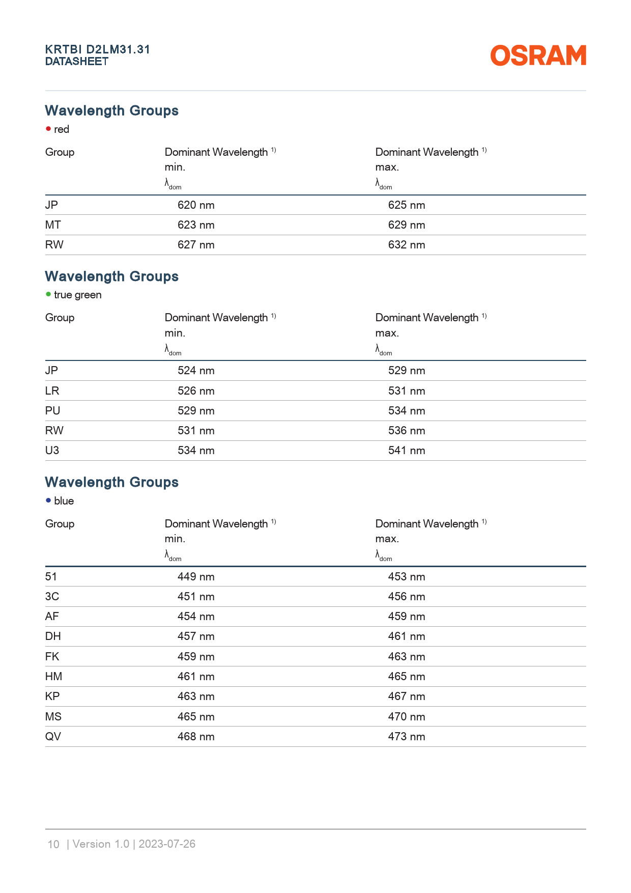 link to page 37 link to page 37 link to page 37 link to page 37 link to page 37 link to page 37 KRTBI D2LM31.31 DATA A SHEET Wavelength Groups ● red Group Dominant Wavelength 1) Dominant Wavelength 1) min. max. λ λ dom dom JP 620 nm 625 nm MT 623 nm 629 nm RW 627 nm 632 nm Wavelength Groups ● true green Group Dominant Wavelength 1) Dominant Wavelength 1) min. max. λ λ dom dom JP 524 nm 529 nm LR 526 nm 531 nm PU 529 nm 534 nm RW 531 nm 536 nm U3 534 nm 541 nm Wavelength Groups ● blue Group Dominant Wavelength 1) Dominant Wavelength 1) min. max. λ λ dom dom 51 449 nm 453 nm 3C 451 nm 456 nm AF 454 nm 459 nm DH 457 nm 461 nm FK 459 nm 463 nm HM 461 nm 465 nm KP 463 nm 467 nm MS 465 nm 470 nm QV 468 nm 473 nm 10 | Version 1.0 | 2023-07-26