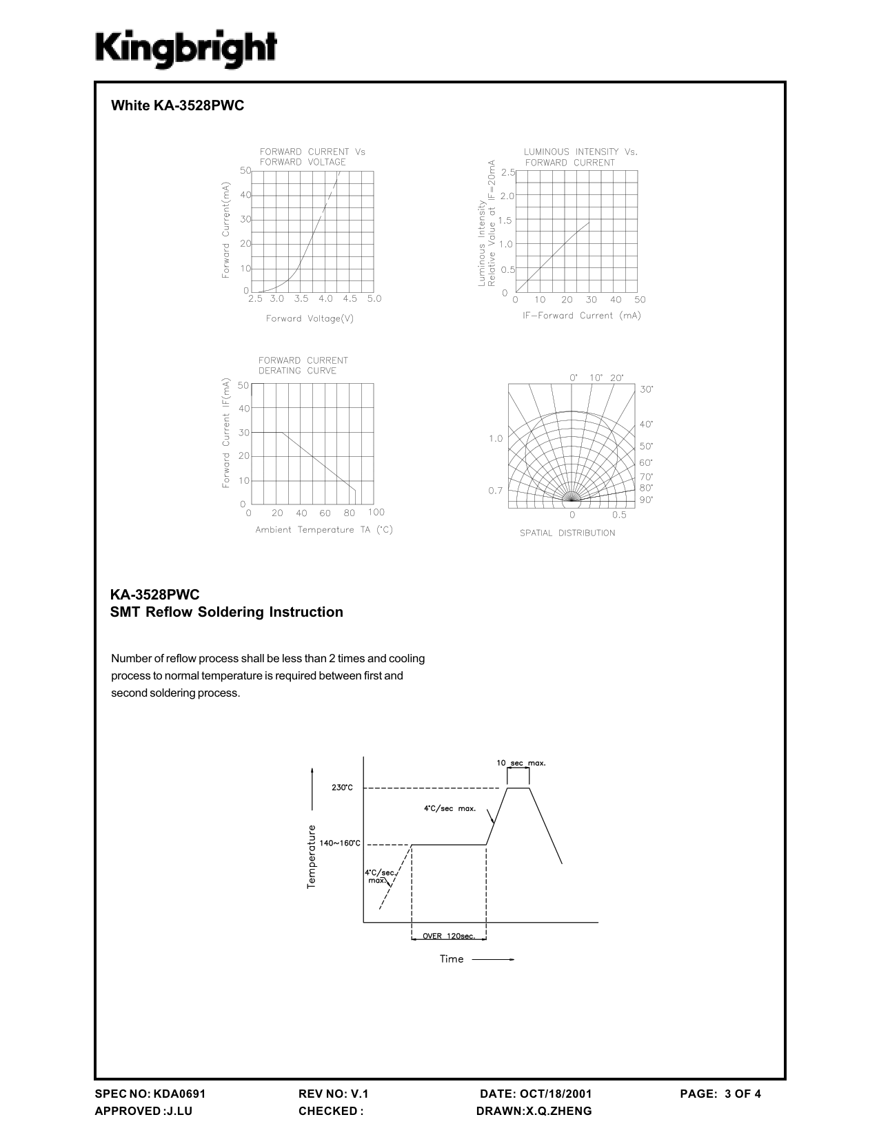 White KA-3528PWC KA-3528PWC SMT Reflow Soldering Instruction Number of reflow process shall be less than 2 times and cooling process to normal temperature is required between first and second soldering process. SPEC NO: KDA0691 REV NO: V.1 DATE: OCT/18/2001 PAGE: 3 OF 4 APPROVED :J.LU CHECKED : DRAWN:X.Q.ZHENG