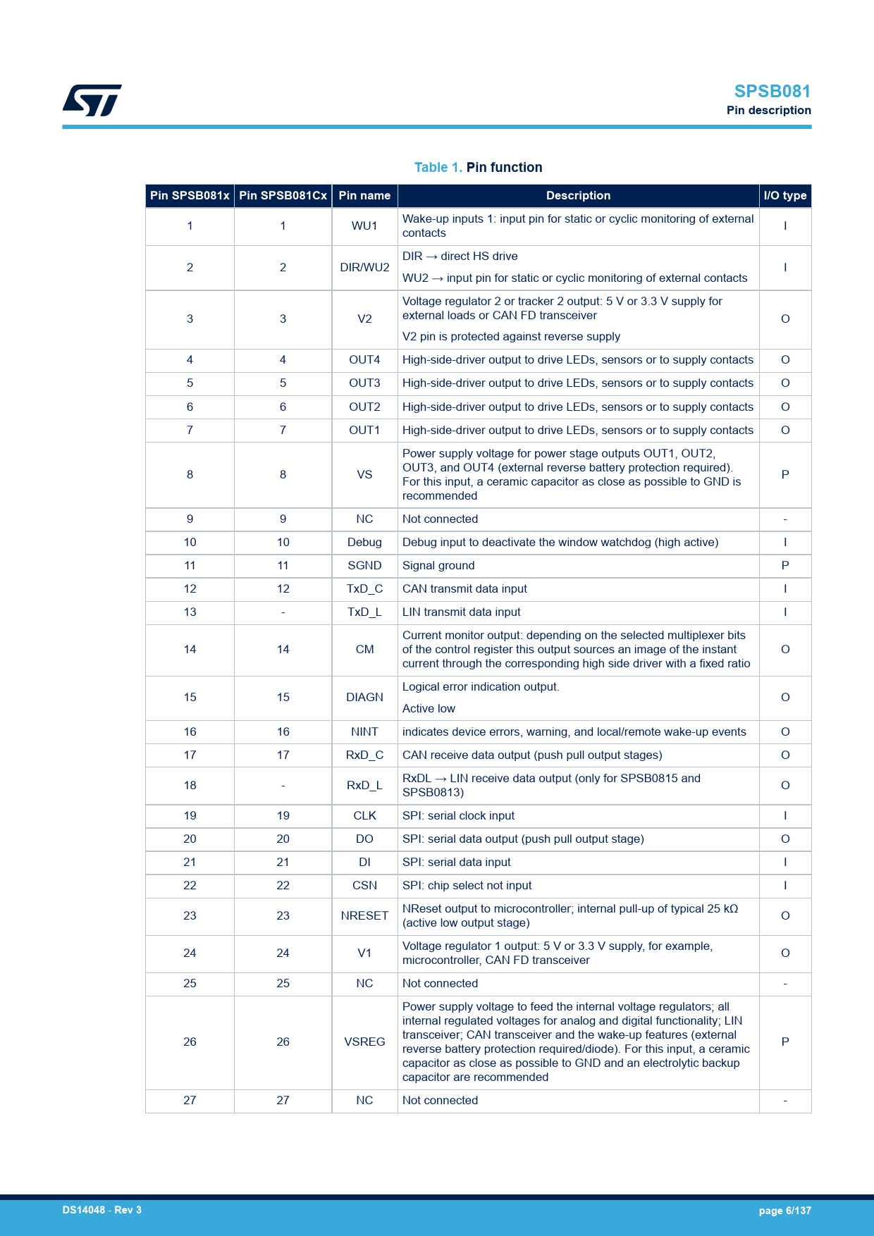 SPSB081Pin descriptionTable 1. Pin functionPin SPSB081x Pin SPSB081Cx Pin nameDescriptionI/O type Wake-up inputs 1: input pin for static or cyclic monitoring of external 1 1 WU1 I contacts DIR → direct HS drive 2 2 DIR/WU2 I WU2 → input pin for static or cyclic monitoring of external contacts Voltage regulator 2 or tracker 2 output: 5 V or 3.3 V supply for 3 3 V2 external loads or CAN FD transceiver O V2 pin is protected against reverse supply 4 4 OUT4 High-side-driver output to drive LEDs, sensors or to supply contacts O 5 5 OUT3 High-side-driver output to drive LEDs, sensors or to supply contacts O 6 6 OUT2 High-side-driver output to drive LEDs, sensors or to supply contacts O 7 7 OUT1 High-side-driver output to drive LEDs, sensors or to supply contacts O Power supply voltage for power stage outputs OUT1, OUT2, OUT3, and OUT4 (external reverse battery protection required). 8 8 VS P For this input, a ceramic capacitor as close as possible to GND is recommended 9 9 NC Not connected - 10 10 Debug Debug input to deactivate the window watchdog (high active) I 11 11 SGND Signal ground P 12 12 TxD_C CAN transmit data input I 13 - TxD_L LIN transmit data input I Current monitor output: depending on the selected multiplexer bits 14 14 CM of the control register this output sources an image of the instant O current through the corresponding high side driver with a fixed ratio Logical error indication output. 15 15 DIAGN O Active low 16 16 NINT indicates device errors, warning, and local/remote wake-up events O 17 17 RxD_C CAN receive data output (push pull output stages) O RxDL → LIN receive data output (only for SPSB0815 and 18 - RxD_L O SPSB0813) 19 19 CLK SPI: serial clock input I 20 20 DO SPI: serial data output (push pull output stage) O 21 21 DI SPI: serial data input I 22 22 CSN SPI: chip select not input I NReset output to microcontroller; internal pull-up of typical 25 kΩ 23 23 NRESET O (active low output stage) Voltage regulator 1 output: 5 V or 3.3 V supply, for example, 24 24 V1 O microcontroller, CAN FD transceiver 25 25 NC Not connected - Power supply voltage to feed the internal voltage regulators; all internal regulated voltages for analog and digital functionality; LIN transceiver; CAN transceiver and the wake-up features (external 26 26 VSREG P reverse battery protection required/diode). For this input, a ceramic capacitor as close as possible to GND and an electrolytic backup capacitor are recommended 27 27 NC Not connected - DS14048 - Rev 3page 6/137 Document Outline Device summary Features Applications Description 1 Block diagram and pin description 1.1 Block diagram 1.2 Pin description 2 Maximum ratings 2.1 Operating range 2.1.1 Supply voltage ranges 2.2 Absolute maximum ratings 2.3 Temperature ranges and thermal data 3 Functional description 3.1 Supply VS and VSREG 3.2 Voltage regulators 3.2.1 Voltage regulator: V1 3.2.2 Voltage regulator: V2 3.2.3 Voltage regulator failure 3.2.4 Short to ground detection 3.2.5 Voltage regulator behavior 3.3 Operating modes 3.3.1 Active mode 3.3.2 SW-debug mode 3.3.3 V1_standby mode 3.3.4 Interrupt 3.3.5 VBAT_standby mode 3.4 Wake-up from standby modes 3.4.1 Wake-up inputs 3.5 Functional overview (truth table) 3.6 Configurable window watchdog 3.6.1 Change watchdog timing 3.7 Fail safe mode 3.7.1 Temporary failures 3.7.2 Non recoverable failures - Forced in VBAT_standby mode 3.8 Reset output (NRESET) 3.9 DIAGN output 3.10 V1 overvoltage detection 3.11 LIN bus interfaces (only for SPSB0815 and SPSB0813) 3.11.1 Features 3.11.2 Error handling 3.11.2.1 Dominant TXD_L time out 3.11.2.2 Permanent recessive 3.11.2.3 Permanent dominant 3.11.3 Wake-up from standby modes 3.11.3.1 Pattern wake-up (default) 3.11.3.2 Status change wake-up - Recessive-to-dominant 3.11.3.3 Status change wake-up - Dominant-to-recessive 3.12 CAN FD bus transceiver 3.12.1 Features 3.12.2 CAN transceiver supply 3.12.3 CAN transceiver operating modes 3.12.4 CAN error handling 3.12.4.1 Dominant TXDC time out 3.12.4.2 CAN bus permanent recessive 3.12.4.3 CAN Permanent dominant 3.12.4.4 RXDC permanent recessive 3.12.5 Wake-up by CAN 3.12.6 CAN receive only mode 3.12.7 CAN looping mode 3.13 Power supply fail 3.13.1 VS supply failure 3.13.2 VSREG supply failure 3.14 Thermal state machine 3.15 Power outputs OUT1..4 3.16 Open-load detection 3.17 Overcurrent detection 3.18 Current monitor 3.19 Constant current mode 3.20 Temperature warning and shutdown 3.21 Thermal clusters 3.22 Functional safety management 4 Serial peripheral interface (SPI) 4.1 ST-SPI 4.1.1 Physical layer 4.2 Signal description 4.2.1 Clock and data characteristics 4.2.2 Communication protocol 4.2.2.1 SDI frame 4.2.2.2 Operating code 4.2.2.3 Advanced operation codes 4.2.2.4 Data-in payload 4.2.2.5 SDO frame 4.2.2.6 Global status byte (GSB) 4.2.2.7 Data-out payload 4.3 Address definition 4.3.1 Information registers 4.3.1.1 Device identification registers 4.3.1.2 SPI modes 4.3.1.3 SPI burst read 4.3.1.4 SPI data length 4.3.2 Device application registers (RAM) 4.4 Protocol failure detection 4.4.1 Clock monitor 4.4.2 SCK polarity (CPOL) check 4.4.3 SCK phase (CPHA) check 4.4.4 CSN timeout 4.4.5 SDI stuck at GND 4.4.6 SDI stuck at HIGH 4.4.7 SDO stuck at GND and HIGH 5 Electrical characteristics 5.1 Oscillator 5.2 Power-on reset (VSREG) 5.3 Voltage regulator V1 5.4 Voltage regulator V2 5.5 Reset output 5.6 DIAGN output 5.7 Watchdog 5.8 Current monitor output (CM) 5.9 Outputs OUT1..OUT4 5.10 Power outputs switching times 5.11 Output current threshold 5.12 Wake-up inputs (WU1, DIR/WU2) 5.13 CAN FD transceiver 5.14 LIN transceiver (only for SPSB0815 and SPSB0813) 5.15 SPI 5.16 Debug input 5.17 Interrupt output 5.18 Timer1 and Timer2 5.19 SGND loss comparator 6 Application 7 SPI registers 7.1 Global status byte (GSB) 7.2 Control registers overview 7.3 Status register overview 7.4 Control registers 7.5 Status registers 8 Package information 8.1 QFN32L Epad (5.0x5.0x1.0 mm) package information Revision history