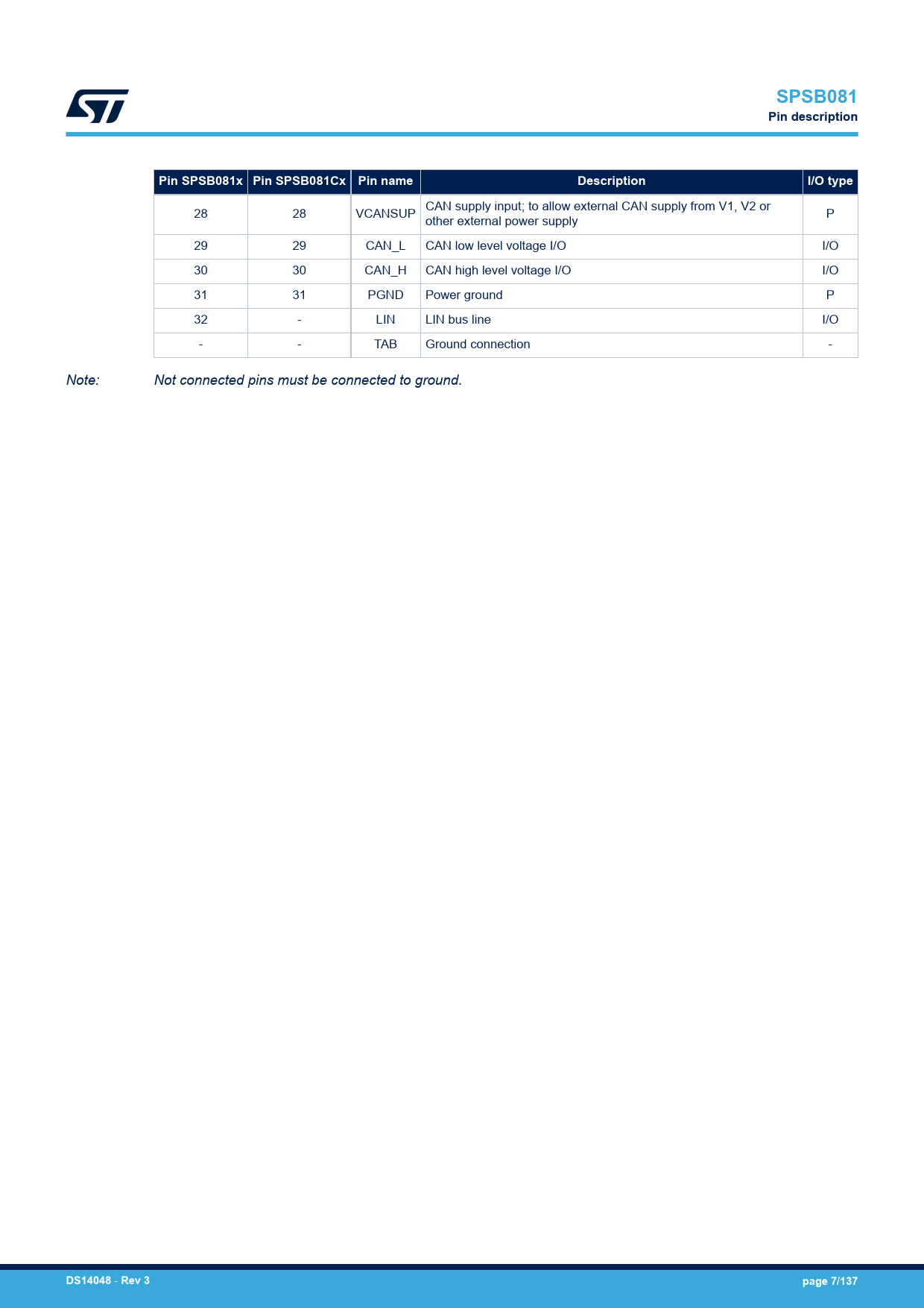 SPSB081Pin descriptionPin SPSB081x Pin SPSB081Cx Pin nameDescriptionI/O type CAN supply input; to allow external CAN supply from V1, V2 or 28 28 VCANSUP P other external power supply 29 29 CAN_L CAN low level voltage I/O I/O 30 30 CAN_H CAN high level voltage I/O I/O 31 31 PGND Power ground P 32 - LIN LIN bus line I/O - - TAB Ground connection - Note: Not connected pins must be connected to ground. DS14048 - Rev 3page 7/137 Document Outline Device summary Features Applications Description 1 Block diagram and pin description 1.1 Block diagram 1.2 Pin description 2 Maximum ratings 2.1 Operating range 2.1.1 Supply voltage ranges 2.2 Absolute maximum ratings 2.3 Temperature ranges and thermal data 3 Functional description 3.1 Supply VS and VSREG 3.2 Voltage regulators 3.2.1 Voltage regulator: V1 3.2.2 Voltage regulator: V2 3.2.3 Voltage regulator failure 3.2.4 Short to ground detection 3.2.5 Voltage regulator behavior 3.3 Operating modes 3.3.1 Active mode 3.3.2 SW-debug mode 3.3.3 V1_standby mode 3.3.4 Interrupt 3.3.5 VBAT_standby mode 3.4 Wake-up from standby modes 3.4.1 Wake-up inputs 3.5 Functional overview (truth table) 3.6 Configurable window watchdog 3.6.1 Change watchdog timing 3.7 Fail safe mode 3.7.1 Temporary failures 3.7.2 Non recoverable failures - Forced in VBAT_standby mode 3.8 Reset output (NRESET) 3.9 DIAGN output 3.10 V1 overvoltage detection 3.11 LIN bus interfaces (only for SPSB0815 and SPSB0813) 3.11.1 Features 3.11.2 Error handling 3.11.2.1 Dominant TXD_L time out 3.11.2.2 Permanent recessive 3.11.2.3 Permanent dominant 3.11.3 Wake-up from standby modes 3.11.3.1 Pattern wake-up (default) 3.11.3.2 Status change wake-up - Recessive-to-dominant 3.11.3.3 Status change wake-up - Dominant-to-recessive 3.12 CAN FD bus transceiver 3.12.1 Features 3.12.2 CAN transceiver supply 3.12.3 CAN transceiver operating modes 3.12.4 CAN error handling 3.12.4.1 Dominant TXDC time out 3.12.4.2 CAN bus permanent recessive 3.12.4.3 CAN Permanent dominant 3.12.4.4 RXDC permanent recessive 3.12.5 Wake-up by CAN 3.12.6 CAN receive only mode 3.12.7 CAN looping mode 3.13 Power supply fail 3.13.1 VS supply failure 3.13.2 VSREG supply failure 3.14 Thermal state machine 3.15 Power outputs OUT1..4 3.16 Open-load detection 3.17 Overcurrent detection 3.18 Current monitor 3.19 Constant current mode 3.20 Temperature warning and shutdown 3.21 Thermal clusters 3.22 Functional safety management 4 Serial peripheral interface (SPI) 4.1 ST-SPI 4.1.1 Physical layer 4.2 Signal description 4.2.1 Clock and data characteristics 4.2.2 Communication protocol 4.2.2.1 SDI frame 4.2.2.2 Operating code 4.2.2.3 Advanced operation codes 4.2.2.4 Data-in payload 4.2.2.5 SDO frame 4.2.2.6 Global status byte (GSB) 4.2.2.7 Data-out payload 4.3 Address definition 4.3.1 Information registers 4.3.1.1 Device identification registers 4.3.1.2 SPI modes 4.3.1.3 SPI burst read 4.3.1.4 SPI data length 4.3.2 Device application registers (RAM) 4.4 Protocol failure detection 4.4.1 Clock monitor 4.4.2 SCK polarity (CPOL) check 4.4.3 SCK phase (CPHA) check 4.4.4 CSN timeout 4.4.5 SDI stuck at GND 4.4.6 SDI stuck at HIGH 4.4.7 SDO stuck at GND and HIGH 5 Electrical characteristics 5.1 Oscillator 5.2 Power-on reset (VSREG) 5.3 Voltage regulator V1 5.4 Voltage regulator V2 5.5 Reset output 5.6 DIAGN output 5.7 Watchdog 5.8 Current monitor output (CM) 5.9 Outputs OUT1..OUT4 5.10 Power outputs switching times 5.11 Output current threshold 5.12 Wake-up inputs (WU1, DIR/WU2) 5.13 CAN FD transceiver 5.14 LIN transceiver (only for SPSB0815 and SPSB0813) 5.15 SPI 5.16 Debug input 5.17 Interrupt output 5.18 Timer1 and Timer2 5.19 SGND loss comparator 6 Application 7 SPI registers 7.1 Global status byte (GSB) 7.2 Control registers overview 7.3 Status register overview 7.4 Control registers 7.5 Status registers 8 Package information 8.1 QFN32L Epad (5.0x5.0x1.0 mm) package information Revision history