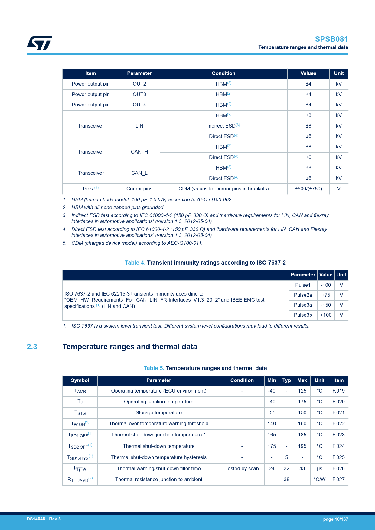 TAMB Operating temperature (ECU environment) - -40 - 125 °C F.019 TJ Operating junction temperature - -40 - 175 °C F.020 TSTG Storage temperature - -55 - 150 °C F.021 T (1) W ON Thermal over temperature warning threshold - 140 - 160 °C F.022 T (1) SD1 OFF Thermal shut-down junction temperature 1 - 165 - 185 °C F.023 T (1) SD2 OFF Thermal shut-down temperature - 175 - 195 °C F.024 T (1) SD12HYS Thermal shut-down temperature hysteresis - - 5 - °C F.025 tfTjTW Thermal warning/shut-down filter time Tested by scan 24 32 43 µs F.026 R (2) TH JAMB Thermal resistance junction-to-ambient - - 38 - °C/W F.027