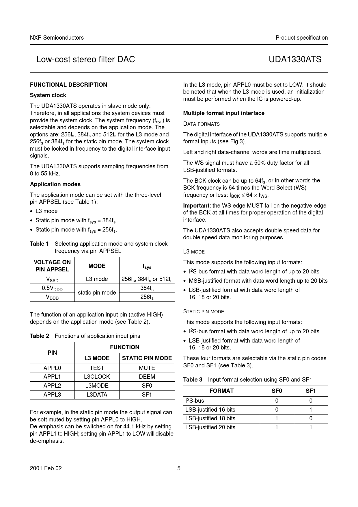 These four formats are selectable via the static pin codes SF0 and SF1 (see Table 3). APPL0 TEST MUTE APPL1 L3CLOCK DEEM