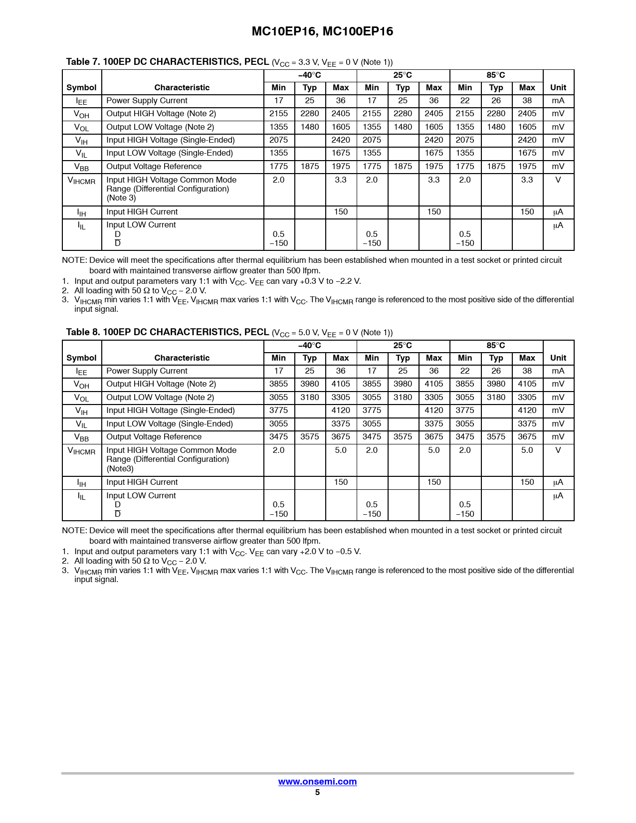 IEE Power Supply Current 17 25 36 17 25 36 22 26 38 mA VOH Output HIGH Voltage (Note 2) 3855 3980 4105 3855 3980 4105 3855 3980 4105 mV VOL Output LOW Voltage (Note 2) 3055 3180 3305 3055 3180 3305 3055 3180 3305 mV VIH Input HIGH Voltage (Single-Ended) 3775 4120 3775 4120 3775 4120 mV VIL Input LOW Voltage (Single-Ended) 3055 3375 3055 3375 3055 3375 mV VBB Output Voltage Reference 3475 3575 3675 3475 3575 3675 3475 3575 3675 mV VIHCMR Input HIGH Voltage Common Mode 2.0 5.0 2.0 5.0 2.0 5.0 V Range (Differential Configuration) (Note3) IIH Input HIGH Current 150 150 150 mA IIL Input LOW Current mA D 0.5 0.5 0.5 D −150 −150 −150 NOTE: Device will meet the specifications after thermal equilibrium has been established when mounted in a test socket or printed circuit board with maintained transverse airflow greater than 500 lfpm. 1. Input and output parameters vary 1:1 with VCC. VEE can vary +2.0 V to −0.5 V. 2. All loading with 50 W to VCC − 2.0 V. 3. VIHCMR min varies 1:1 with VEE, VIHCMR max varies 1:1 with VCC. The VIHCMR range is referenced to the most positive side of the differential input signal.