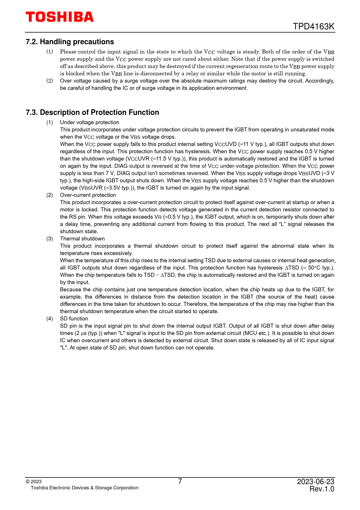 (1) Under voltage protection This product incorporates under voltage protection circuits to prevent the IGBT from operating in unsaturated mode when the VCC voltage or the VBS voltage drops. When the VCC power supply falls to this product internal setting VCCUVD (=11 V typ.), all IGBT outputs shut down regardless of the input. This protection function has hysteresis. When the VCC power supply reaches 0.5 V higher than the shutdown voltage (VCCUVR (=11.5 V typ.)), this product is automatically restored and the IGBT is turned on again by the input. DIAG output is reversed at the time of VCC under-voltage protection. When the VCC power supply is less than 7 V, DIAG output isn't sometimes reversed. When the VBS supply voltage drops VBSUVD (=3 V typ.), the high-side IGBT output shuts down. When the VBS supply voltage reaches 0.5 V higher than the shutdown voltage (VBSUVR (=3.5V typ.)), the IGBT is turned on again by the input signal. (2) Over-current protection This product incorporates a over-current protection circuit to protect itself against over-current at startup or when a motor is locked. This protection function detects voltage generated in the current detection resistor connected to the RS pin. When this voltage exceeds VR (=0.5 V typ.), the IGBT output, which is on, temporarily shuts down after a delay time, preventing any additional current from flowing to this product. The next al “L” signal releases the shutdown state. (3) Thermal shutdown This product incorporates a thermal shutdown circuit to protect itself against the abnormal state when its temperature rises excessively. When the temperature of this chip rises to the internal setting TSD due to external causes or internal heat generation, all IGBT outputs shut down regardless of the input. This protection function has hysteresis TSD (= 50°C typ.). When the chip temperature falls to TSD − TSD, the chip is automatically restored and the IGBT is turned on again by the input. Because the chip contains just one temperature detection location, when the chip heats up due to the IGBT, for example, the differences in distance from the detection location in the IGBT (the source of the heat) cause differences in the time taken for shutdown to occur. Therefore, the temperature of the chip may rise higher than the thermal shutdown temperature when the circuit started to operate. (4) SD function SD pin is the input signal pin to shut down the internal output IGBT. Output of all IGBT is shut down after delay times (2 μs (typ.)) when "L" signal is input to the SD pin from external circuit (MCU etc.). It is possible to shut down IC when overcurrent and others is detected by external circuit. Shut down state is released by al of IC input signal "L". At open state of SD pin, shut down function can not operate. © 20 23 7 2023-06-23 Toshiba Electronic Devices & Storage Corporation Rev.1.0