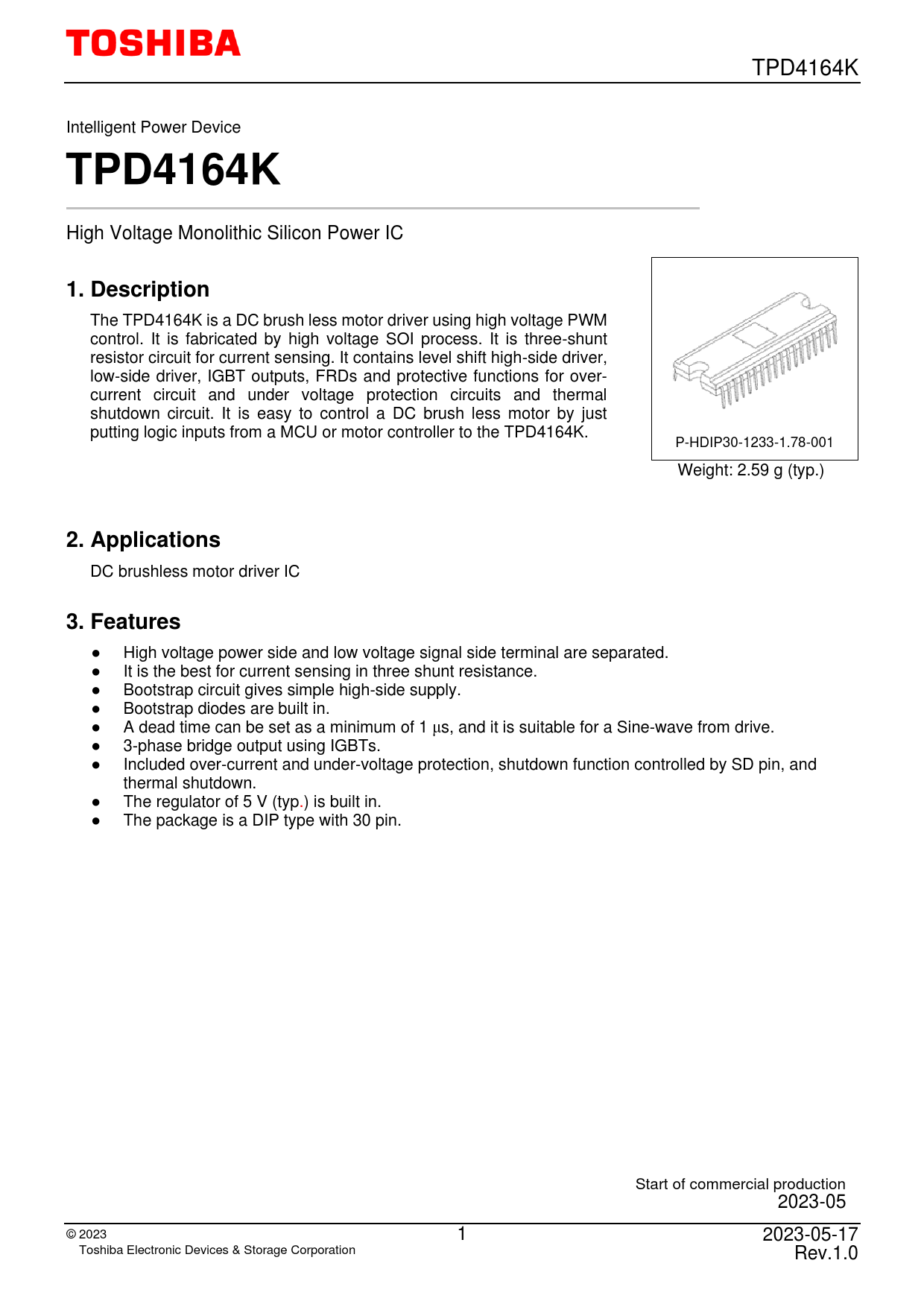 ● High voltage power side and low voltage signal side terminal are separated. ● It is the best for current sensing in three shunt resistance. ● Bootstrap circuit gives simple high-side supply. ● Bootstrap diodes are built in. ● A dead time can be set as a minimum of 1 μs, and it is suitable for a Sine-wave from drive. ● 3-phase bridge output using IGBTs. ● Included over-current and under-voltage protection, shutdown function controlled by SD pin, and thermal shutdown. ● The regulator of 5 V (typ.) is built in. ● The package is a DIP type with 30 pin. Start of commercial production 2023-05 © 20 23 1 2023-05-17 Toshiba Electronic Devices & Storage Corporation Rev.1.0