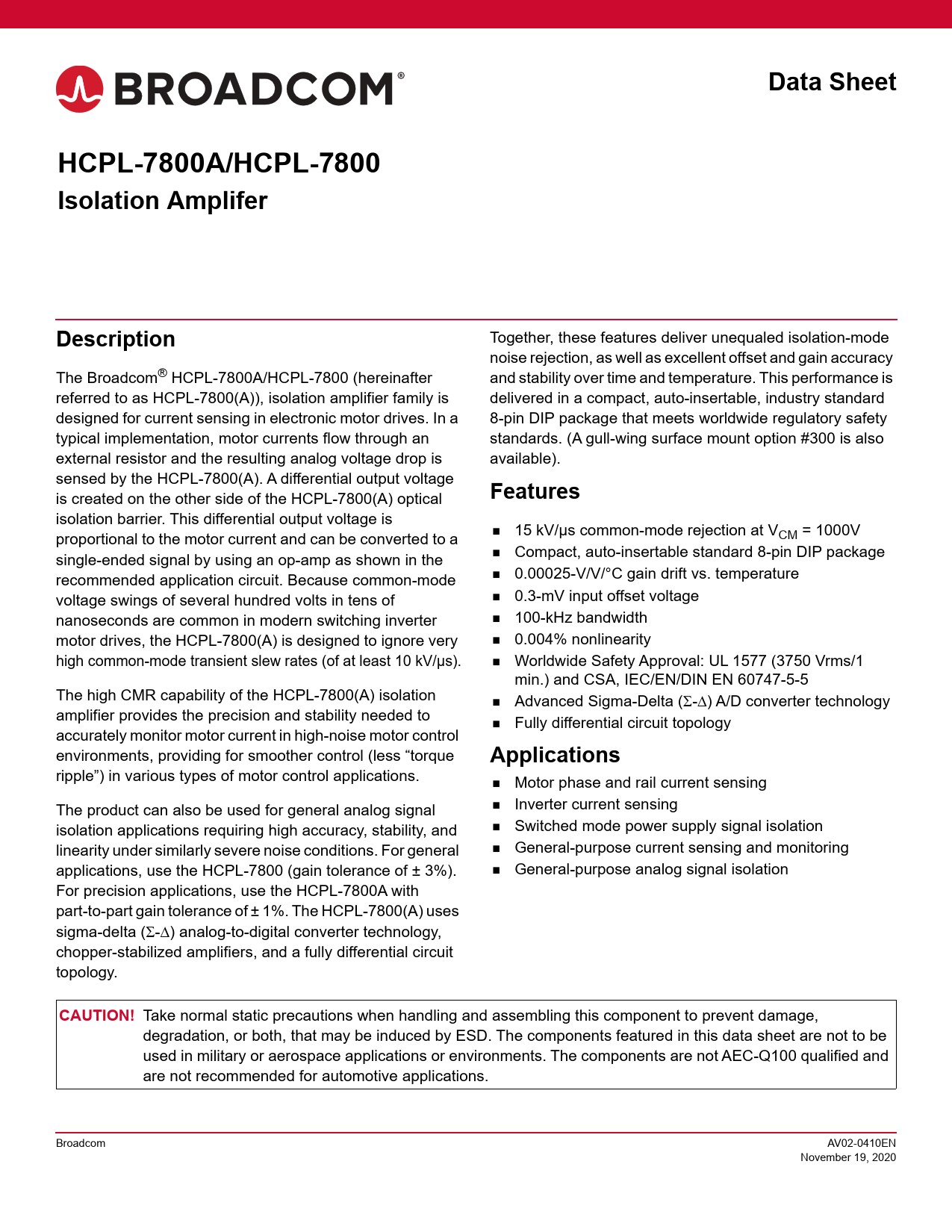 Data SheetHCPL-7800A/HCPL-7800 Isolation AmpliferDescription Together, these features deliver unequaled isolation-mode noise rejection, as well as excellent offset and gain accuracy The Broadcom® HCPL-7800A/HCPL-7800 (hereinafter and stability over time and temperature. This performance is referred to as HCPL-7800(A)), isolation amplifier family is delivered in a compact, auto-insertable, industry standard designed for current sensing in electronic motor drives. In a 8-pin DIP package that meets worldwide regulatory safety typical implementation, motor currents flow through an standards. (A gull-wing surface mount option #300 is also external resistor and the resulting analog voltage drop is available). sensed by the HCPL-7800(A). A differential output voltage is created on the other side of the HCPL-7800(A) optical Features isolation barrier. This differential output voltage is proportional to the motor current and can be converted to a 15 kV/µs common-mode rejection at VCM = 1000V single-ended signal by using an op-amp as shown in the Compact, auto-insertable standard 8-pin DIP package recommended application circuit. Because common-mode 0.00025-V/V/°C gain drift vs. temperature voltage swings of several hundred volts in tens of 0.3-mV input offset voltage nanoseconds are common in modern switching inverter 100-kHz bandwidth motor drives, the HCPL-7800(A) is designed to ignore very 0.004% nonlinearity high common-mode transient slew rates (of at least 10 kV/µs). Worldwide Safety Approval: UL 1577 (3750 Vrms/1 min.) and CSA, IEC/EN/DIN EN 60747-5-5 The high CMR capability of the HCPL-7800(A) isolation Advanced Sigma-Delta (-) A/D converter technology amplifier provides the precision and stability needed to Fully differential circuit topology accurately monitor motor current in high-noise motor control environments, providing for smoother control (less “torque Applications ripple”) in various types of motor control applications. Motor phase and rail current sensing The product can also be used for general analog signal Inverter current sensing isolation applications requiring high accuracy, stability, and Switched mode power supply signal isolation linearity under similarly severe noise conditions. For general General-purpose current sensing and monitoring applications, use the HCPL-7800 (gain tolerance of ± 3%). General-purpose analog signal isolation For precision applications, use the HCPL-7800A with part-to-part gain tolerance of ± 1%. The HCPL-7800(A) uses sigma-delta (-) analog-to-digital converter technology, chopper-stabilized amplifiers, and a fully differential circuit topology. CAUTION! Take normal static precautions when handling and assembling this component to prevent damage, degradation, or both, that may be induced by ESD. The components featured in this data sheet are not to be used in military or aerospace applications or environments. The components are not AEC-Q100 qualified and are not recommended for automotive applications. Broadcom AV02-0410EN November 19, 2020 Document Outline Description Features Applications Functional Diagram Ordering Information Package Outline Drawings Standard DIP Package Gull Wing Surface Mount Option 300 Solder Reflow Profile Regulatory Information IEC/EN/DIN EN 60747-5-5 Insulation Characteristics Insulation and Safety-Related Specifications Absolute Maximum Ratings Recommended Operating Conditions DC Electrical Specifications AC Electrical Specifications Package Characteristics Application Information Power Supplies and Bypassing PC Board Layout Current Sensing Resistors Sense Resistor Connections Output Side Frequently Asked Questions about the HCPL-7800(A) Basics Sense Resistor and Input Filter Isolation and Insulation Accuracy Power Supplies and Start-Up Miscellaneous