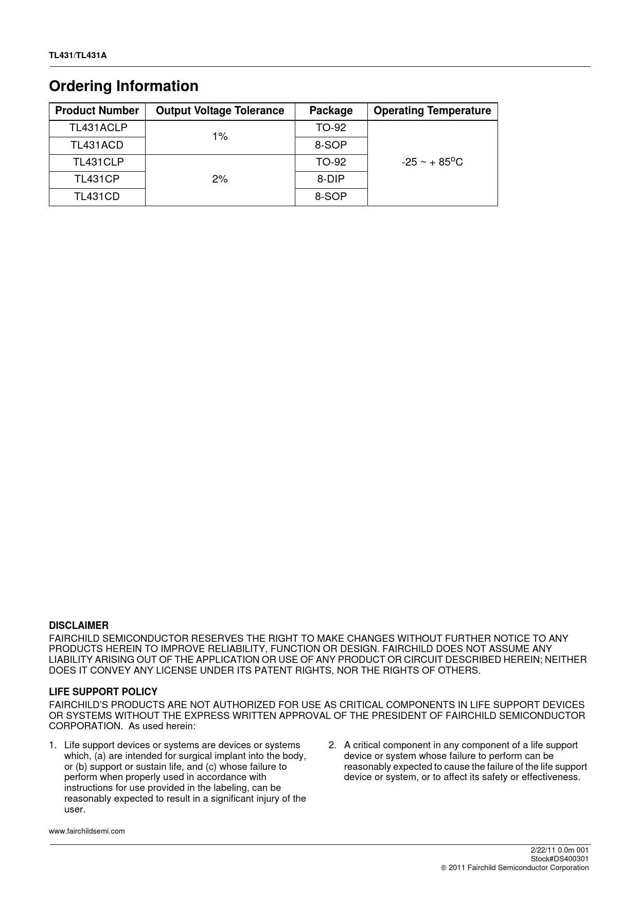 TL431/TL431A. Ordering Information. Product Number. Output Voltage Tolerance. Package. Operating Temperature. DISCLAIMER