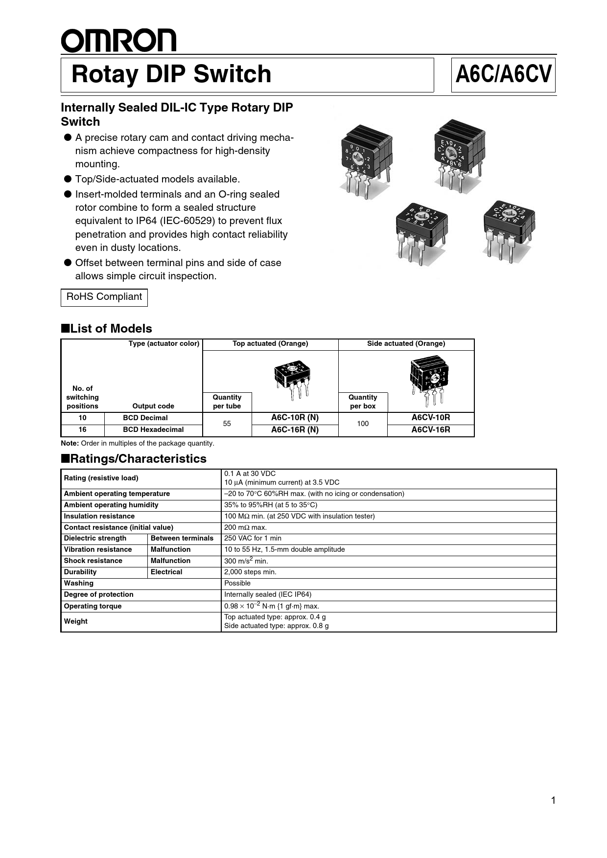 Rotay DIP SwitchA6C/A6CVInternally Sealed DIL-IC Type Rotary DIP Switch ● A precise rotary cam and contact driving mecha- nism achieve compactness for high-density mounting. ● Top/Side-actuated models available. ● Insert-molded terminals and an O-ring sealed rotor combine to form a sealed structure equivalent to IP64 (IEC-60529) to prevent flux penetration and provides high contact reliability even in dusty locations. ● Offset between terminal pins and side of case allows simple circuit inspection. RoHS Compliant ■ List of ModelsType (actuator color)Top actuated (Orange)Side actuated (Orange)No. ofswitchingQuantityQuantitypositionsOutput codeper tubeper box10BCD DecimalA6C-10R (N)A6CV-10R 55 100 16BCD HexadecimalA6C-16R (N)A6CV-16RNote: Order in multiples of the package quantity. ■ Ratings/Characteristics 0.1 A at 30 VDC Rating (resistive load) 10 μA (minimum current) at 3.5 VDC Ambient operating temperature –20 to 70°C 60%RH max. (with no icing or condensation) Ambient operating humidity 35% to 95%RH (at 5 to 35°C) Insulation resistance 100 MΩ min. (at 250 VDC with insulation tester) Contact resistance (initial value) 200 mΩ max. Dielectric strengthBetween terminals 250 VAC for 1 min Vibration resistanceMalfunction 10 to 55 Hz, 1.5-mm double amplitude Shock resistanceMalfunction 300 m/s2 min. DurabilityElectrical 2,000 steps min. Washing Possible Degree of protection Internally sealed (IEC IP64) Operating torque 0.98 × 10−2 N·m {1 gf·m} max. Top actuated type: approx. 0.4 g Weight Side actuated type: approx. 0.8 g 1
