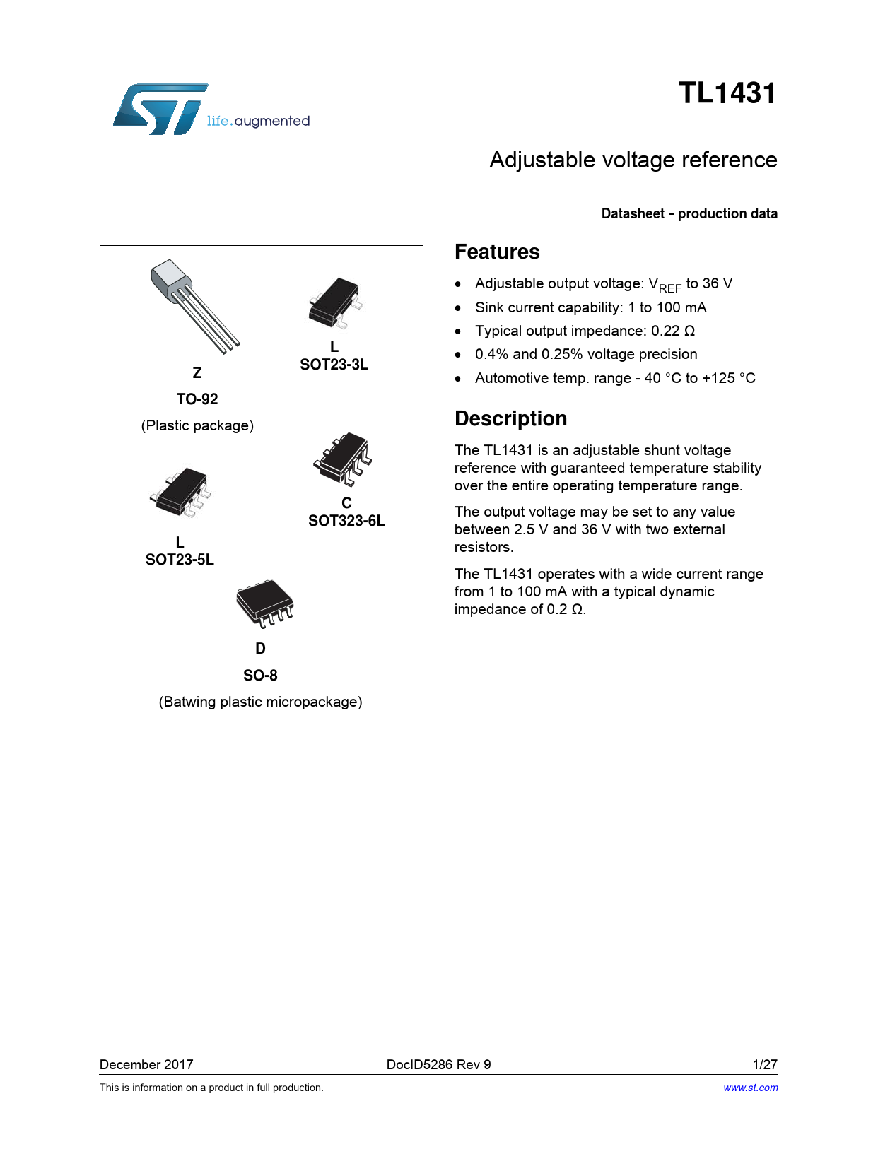 Seiten / Seite27 / 1 — TL1431. Datasheet. production data. Features. SOT23-3L. TO-92. …