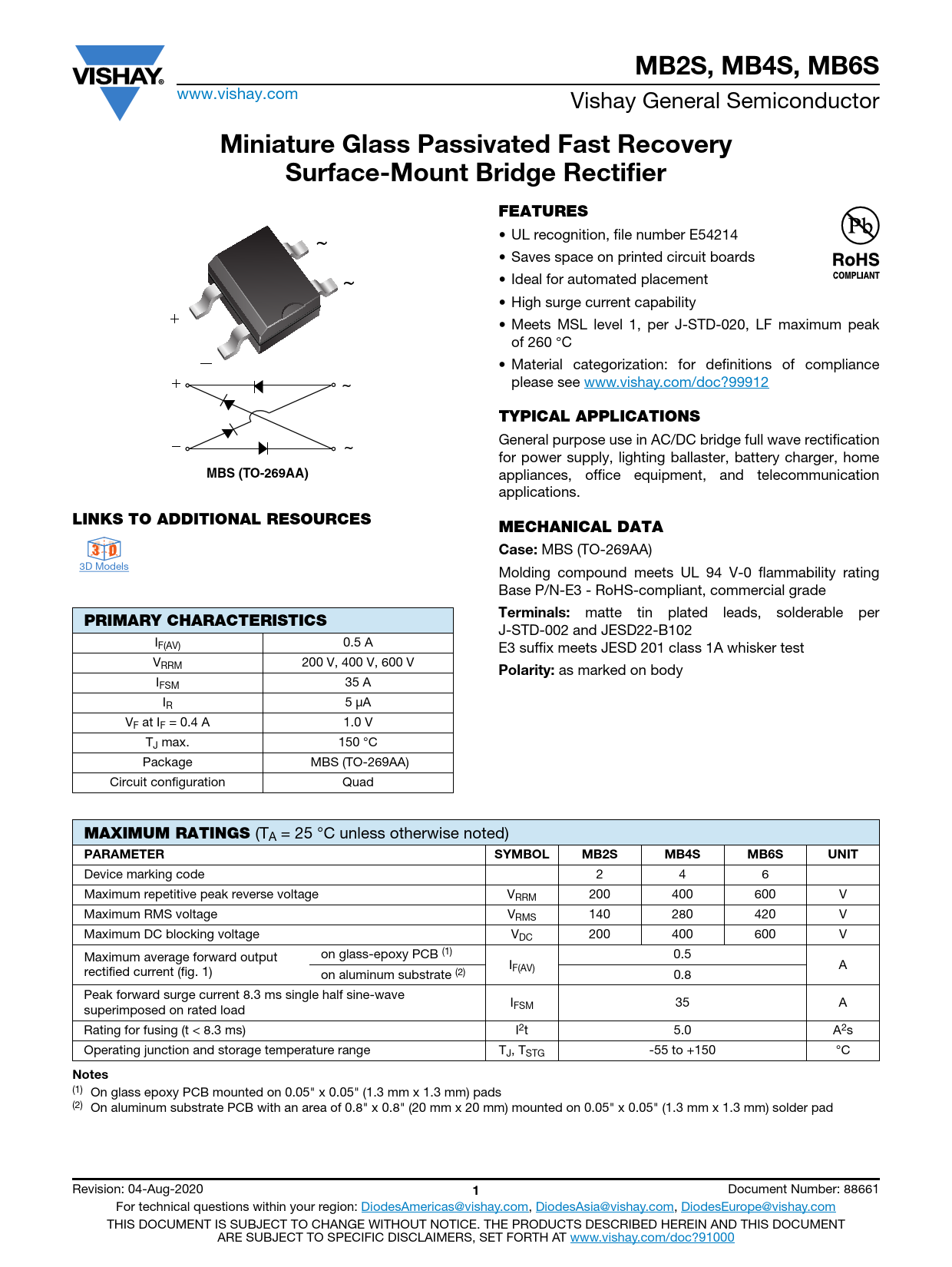 MB2S, MB4S, MB6S www.vishay.com Vishay General Semiconductor Miniature Glass Passivated Fast RecoverySurface-Mount Bridge RectifierFEATURES • UL recognition, file number E54214 ~ • Saves space on printed circuit boards • Ideal for automated placement ~ • High surge current capability • Meets MSL level 1, per J-STD-020, LF maximum peak of 260 °C • Material categorization: for definitions of compliance please see www.vishay.com/doc?99912 ~ TYPICAL APPLICATIONS General purpose use in AC/DC bridge full wave rectification ~ for power supply, lighting ballaster, battery charger, home MBS (TO-269AA) appliances, office equipment, and telecommunication applications. LINKS TO ADDITIONAL RESOURCESMECHANICAL DATAD 33Case: MBS (TO-269AA) D 3D Models Molding compound meets UL 94 V-0 flammability rating Base P/N-E3 - RoHS-compliant, commercial grade Terminals: matte tin plated leads, solderable per PRIMARY CHARACTERISTICS J-STD-002 and JESD22-B102 IF(AV) 0.5 A E3 suffix meets JESD 201 class 1A whisker test VRRM 200 V, 400 V, 600 V Polarity: as marked on body IFSM 35 A IR 5 μA VF at IF = 0.4 A 1.0 V TJ max. 150 °C Package MBS (TO-269AA) Circuit configuration Quad MAXIMUM RATINGS (TA = 25 °C unless otherwise noted) PARAMETERSYMBOL MB2SMB4SMB6SUNIT Device marking code 2 4 6 Maximum repetitive peak reverse voltage VRRM 200 400 600 V Maximum RMS voltage VRMS 140 280 420 V Maximum DC blocking voltage VDC 200 400 600 V Maximum average forward output on glass-epoxy PCB (1) 0.5 I A rectified current (fig. 1) F(AV) on aluminum substrate (2) 0.8 Peak forward surge current 8.3 ms single half sine-wave I superimposed on rated load FSM 35 A Rating for fusing (t < 8.3 ms) I2t 5.0 A2s Operating junction and storage temperature range TJ, TSTG -55 to +150 °C Notes (1) On glass epoxy PCB mounted on 0.05" x 0.05" (1.3 mm x 1.3 mm) pads (2) On aluminum substrate PCB with an area of 0.8" x 0.8" (20 mm x 20 mm) mounted on 0.05" x 0.05" (1.3 mm x 1.3 mm) solder pad Revision: 04-Aug-2020 1 Document Number: 88661 For technical questions within your region: DiodesAmericas@vishay.com, DiodesAsia@vishay.com, DiodesEurope@vishay.com THIS DOCUMENT IS SUBJECT TO CHANGE WITHOUT NOTICE. THE PRODUCTS DESCRIBED HEREIN AND THIS DOCUMENT ARE SUBJECT TO SPECIFIC DISCLAIMERS, SET FORTH AT www.vishay.com/doc?91000