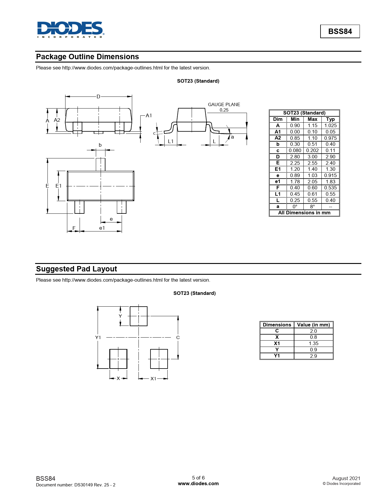 BSS84. Package Outline Dimensions. SOT23 (Standard). Dim Min Max. Typ. All Dimensions in mm. Suggested Pad Layout