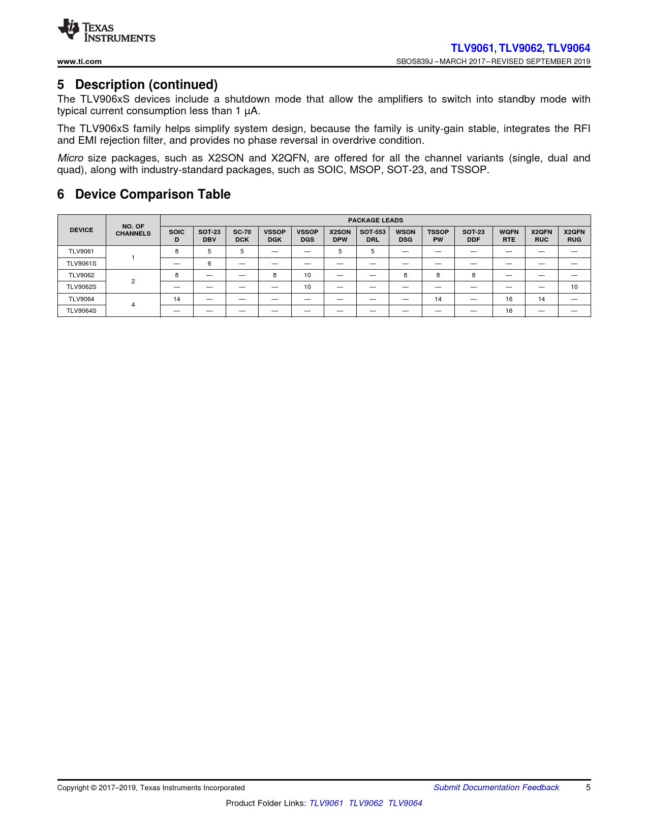 TLV9061,. TLV9062,. TLV9064. www.ti.com. 5 Description (continued). 6 Device Comparison Table. PACKAGE LEADS. NO. OF. DEVICE. CHANNELS