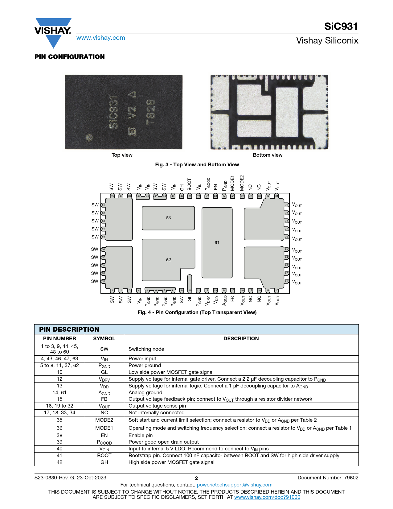 SiC931 www.vishay.com Vishay Siliconix PIN CONFIGURATIONTop viewBottom viewFig. 3 - Top View and Bottom View OOD W W W ND IN IN W W IN H IN G G OUT OUT S S S V V S S V V G BOOT P EN P MODE1 MODE2 NC NC V V 50 49 48 47 46 45 44 43 42 41 40 39 38 37 36 35 34 33 32 31 51 30 SW VOUT 52 29 SW VOUT 63 53 28 SW VOUT 54 27 SW VOUT 55 26 SW VOUT 61 56 25 SW VOUT 57 24 SW VOUT 62 58 23 SW VOUT 59 22 SW VOUT 60 21 SW VOUT 1 2 3 4 5 6 7 8 9 10 11 12 13 14 15 16 17 18 19 20 L W W W IN W V ND S S S ND ND ND ND G ND DD FB V G G G G S G DR V G OUT NC NC OUT OUT P P P P P V A V V V Fig. 4 - Pin Configuration (Top Transparent View)PIN DESCRIPTIONPIN NUMBERSYMBOLDESCRIPTION 1 to 3, 9, 44, 45, SW Switching node 48 to 60 4, 43, 46, 47, 63 VIN Power input 5 to 8, 11, 37, 62 PGND Power ground 10 GL Low side power MOSFET gate signal 12 VDRV Supply voltage for internal gate driver. Connect a 2.2 μF decoupling capacitor to PGND 13 VDD Supply voltage for internal logic. Connect a 1 μF decoupling capacitor to AGND 14, 61 AGND Analog ground 15 FB Output voltage feedback pin; connect to VOUT through a resistor divider network 16, 19 to 32 VOUT Output voltage sense pin 17, 18, 33, 34 NC Not internally connected 35 MODE2 Soft start and current limit selection; connect a resistor to VDD or AGND per Table 2 36 MODE1 Operating mode and switching frequency selection; connect a resistor to VDD or AGND per Table 1 38 EN Enable pin 39 PGOOD Power good open drain output 40 VCIN Input to internal 5 V LDO. Recommend to connect to VIN pins 41 BOOT Bootstrap pin. Connect 100 nF capacitor between BOOT and SW for high side driver supply 42 GH High side power MOSFET gate signal S23-0880-Rev. G, 23-Oct-2023 2 Document Number: 79602 For technical questions, contact: powerictechsupport@vishay.com THIS DOCUMENT IS SUBJECT TO CHANGE WITHOUT NOTICE. THE PRODUCTS DESCRIBED HEREIN AND THIS DOCUMENT ARE SUBJECT TO SPECIFIC DISCLAIMERS, SET FORTH AT www.vishay.com/doc?91000