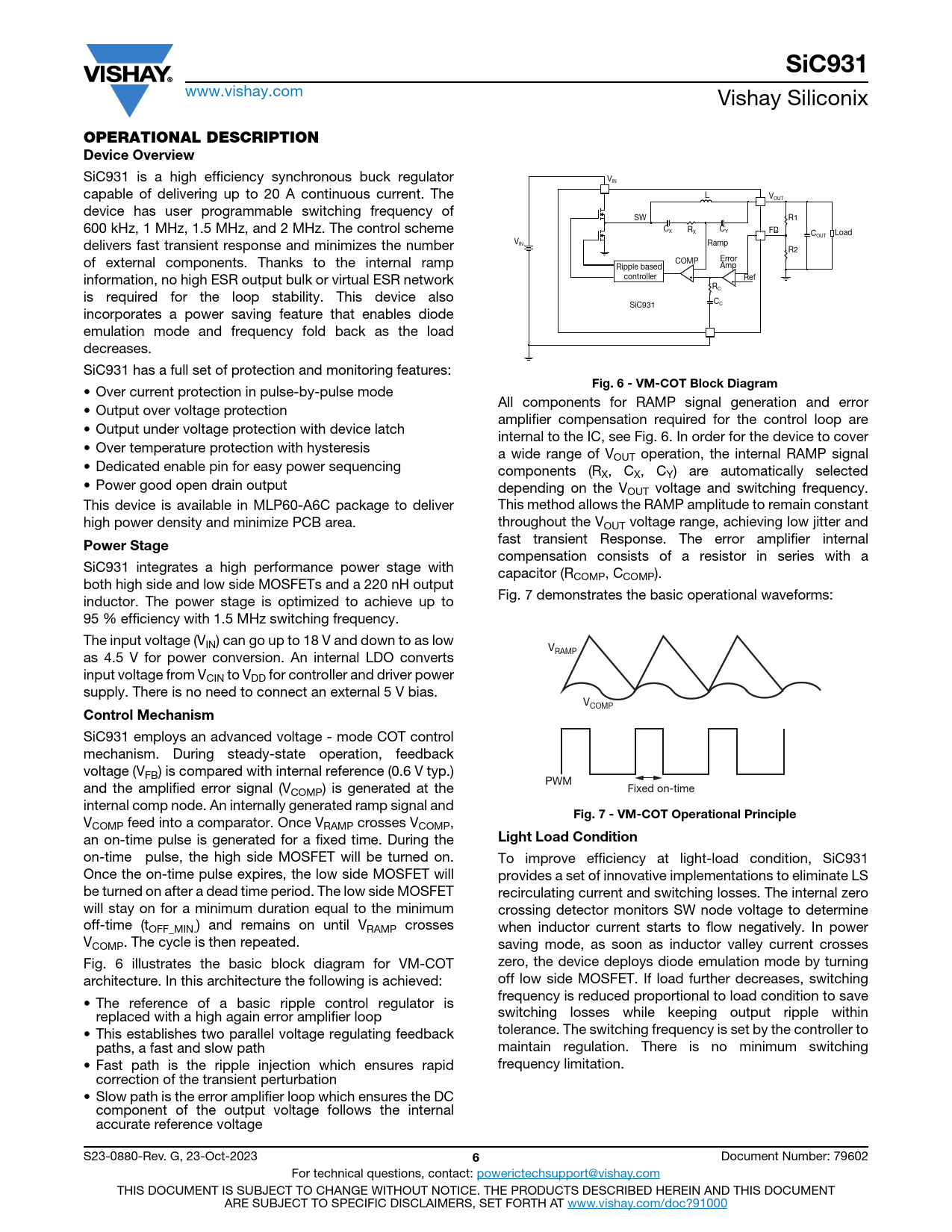 SiC931 employs an advanced voltage - mode COT control mechanism. During steady-state operation, feedback voltage (VFB) is compared with internal reference (0.6 V typ.) PWM and the amplified error signal (VCOMP) is generated at the Fixed on-time internal comp node. An internally generated ramp signal and