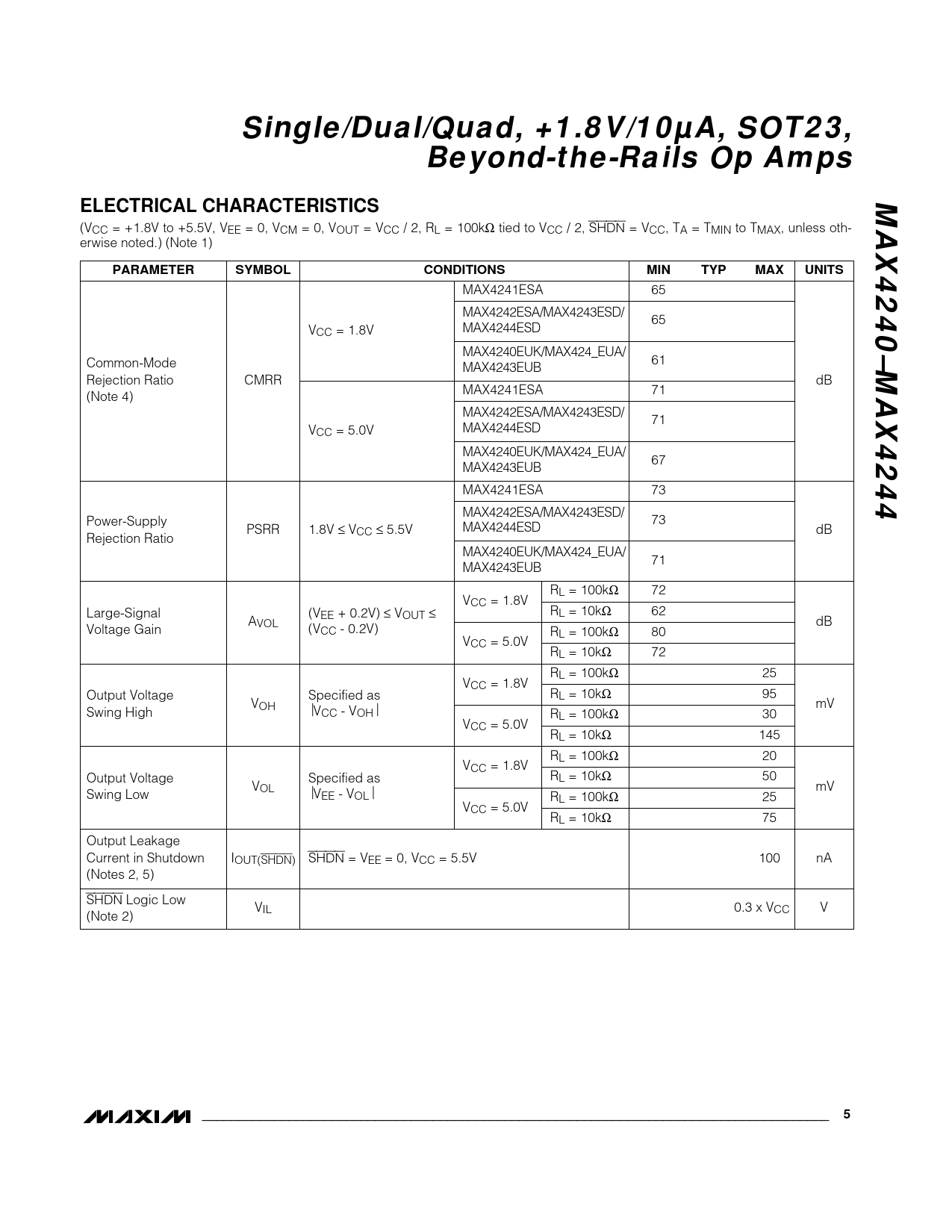 Single/Dual/Quad, +1.8V/10µA, SOT23,. Beyond-the-Rails Op Amps. MAX4240–MAX424. ELECTRICAL CHARACTERISTICS. PARAMETER. SYMBOL